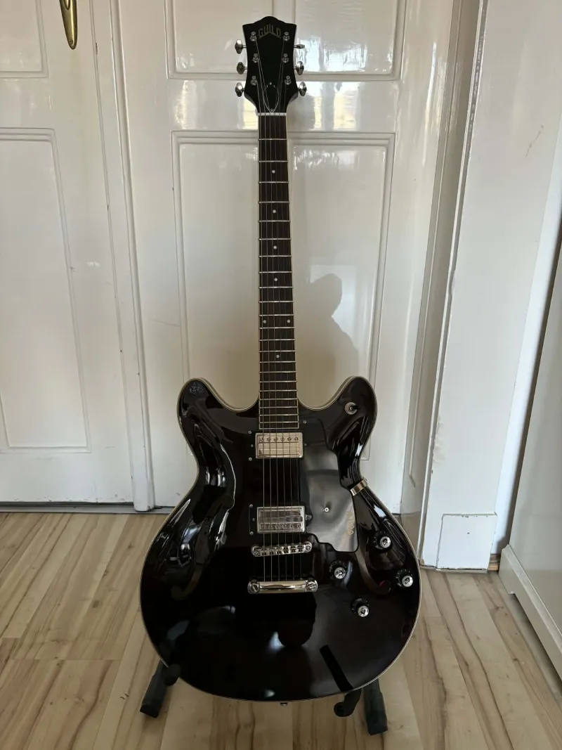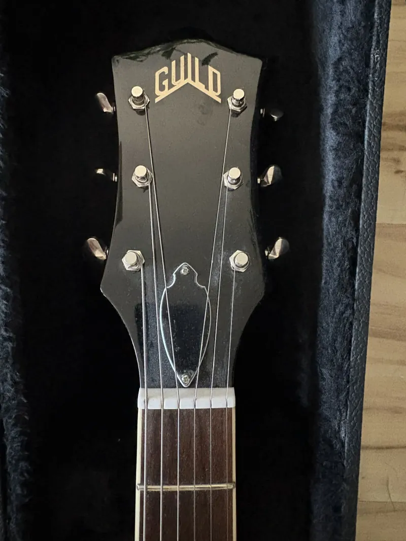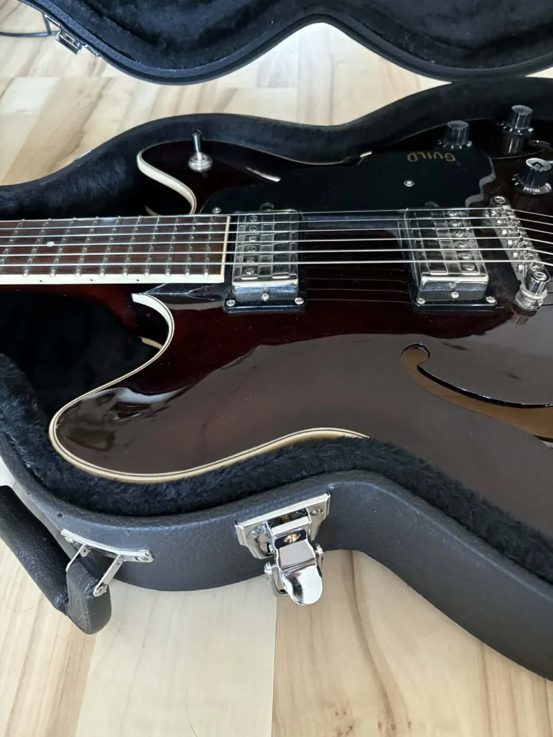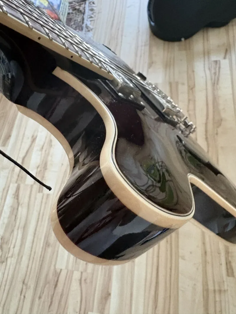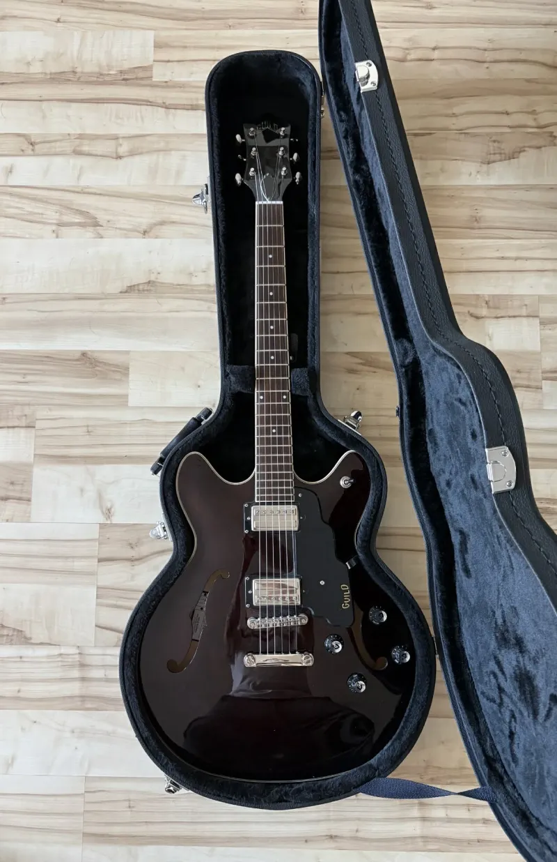 Jó állapotú hollow body elektromos gitár, főleg itthoni dalírásra használtam. Kényelmes, klasszik hang, 50-es évektől kezdve napjainkig sokféle - főleg clean és kicsit crunch - hangszínt szépen tud hozni. A nagy torzítást nem annyira kedveli az üreges test miatt (egy drágább elektronikával vaszeg jobb lenne.) A gyári kulcsok gyengék voltak, ezeket lecseréltem ugyanolyan stílusú jobb minőségűekre, ezt leszámítva eredeti. A színe egy csoda, kb minden fényviszonyra más hatású (fekete, barna, bordó). Pici karcolások vannak a hátán. Gator keménytokot adok hozzá. Csere, beszámítás nem érdekel.