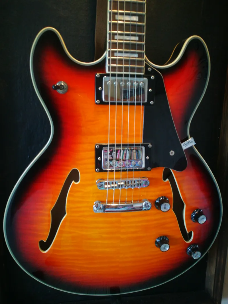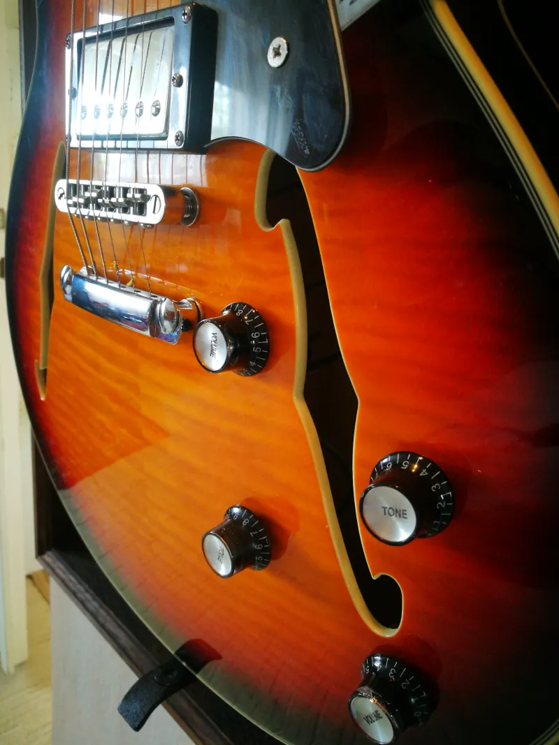 Felezhető pickupok, érintetlen gyári hardware és elektronika. Fontos, hogy nem ilyen bohócpiros mint a képeken, de egyszerűen nem tudom rávenni a telefont hogy a valós színeit mutassa. Egy igazi mély, jegestea jellegű sunburst tónusa van.