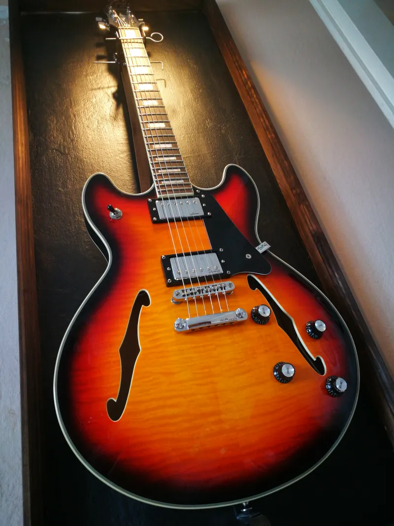 2024 év végén Fél év várakozás után jött meg a Thomann-tól, azóta összesen talán 30-40 órát volt kézben, azt is csak lakásban. Használaton kívül a falon kialakított (nem nyaklógatós) ablakában pihengetett. Esztétikai állapota gyakorlatilag megegyezik azzal amivel a Thomann dobozából kivettem. Annyi különbséggel hogy a nyaki pickup Roswell feliratából lelépett valahová a két L betű.