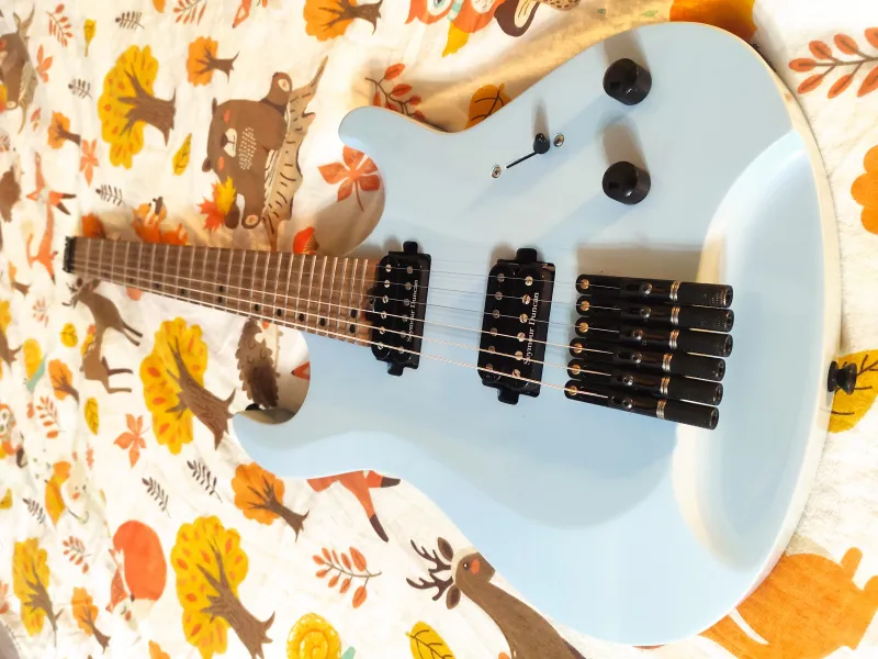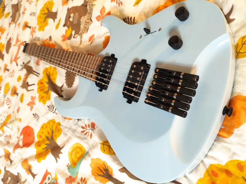 A pickupok cserélve lettek egy Seymour Duncan Jazz/JB szettre. Modern Metál az erőssége, de az nagyon. Pirított juhar nyak, égerfa test, C profil, rozsdamentes acél bundok a főbb jellemzői.