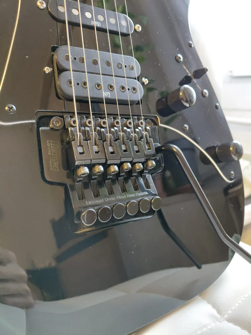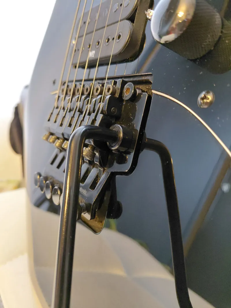 Kapott egy treble bleed-et hogy hangerő elvételkor ne vágja le a magasat, egy koptatólapot, illetve a lötyögős-kilazulós tremoló kar foglalat cserélve lett FLoydRose put-in foglalatra, nem lötyög, nincs kilazulás, minden más eredeti.