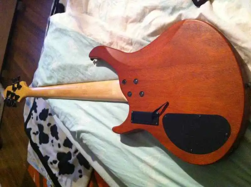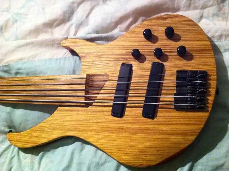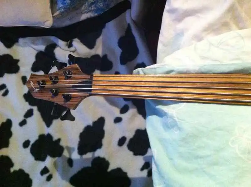 huendeskes5-STRING FRETLESS, CHERRY BODY, ZEBRA WOOD TOP, ZEBRA WOOD FINGERBOARD, LIGHTWEIGHT OIL TUNERS.
