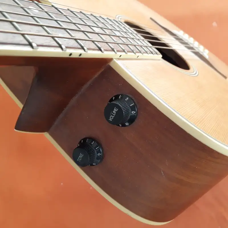 Made in Korea, egyszerű, strapabíró hangszer, beépített hangszedővel. Kihangosítva fémes, éles hangja van, natúrban kellemes, lágy. A hangerőszíbályzó (volume) tökéletesen működik, a hangszínszabályzó nem reagál. Húrcsere ráfér.