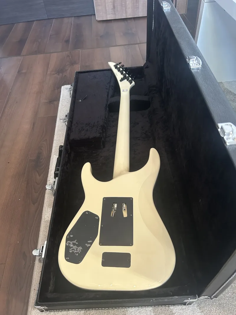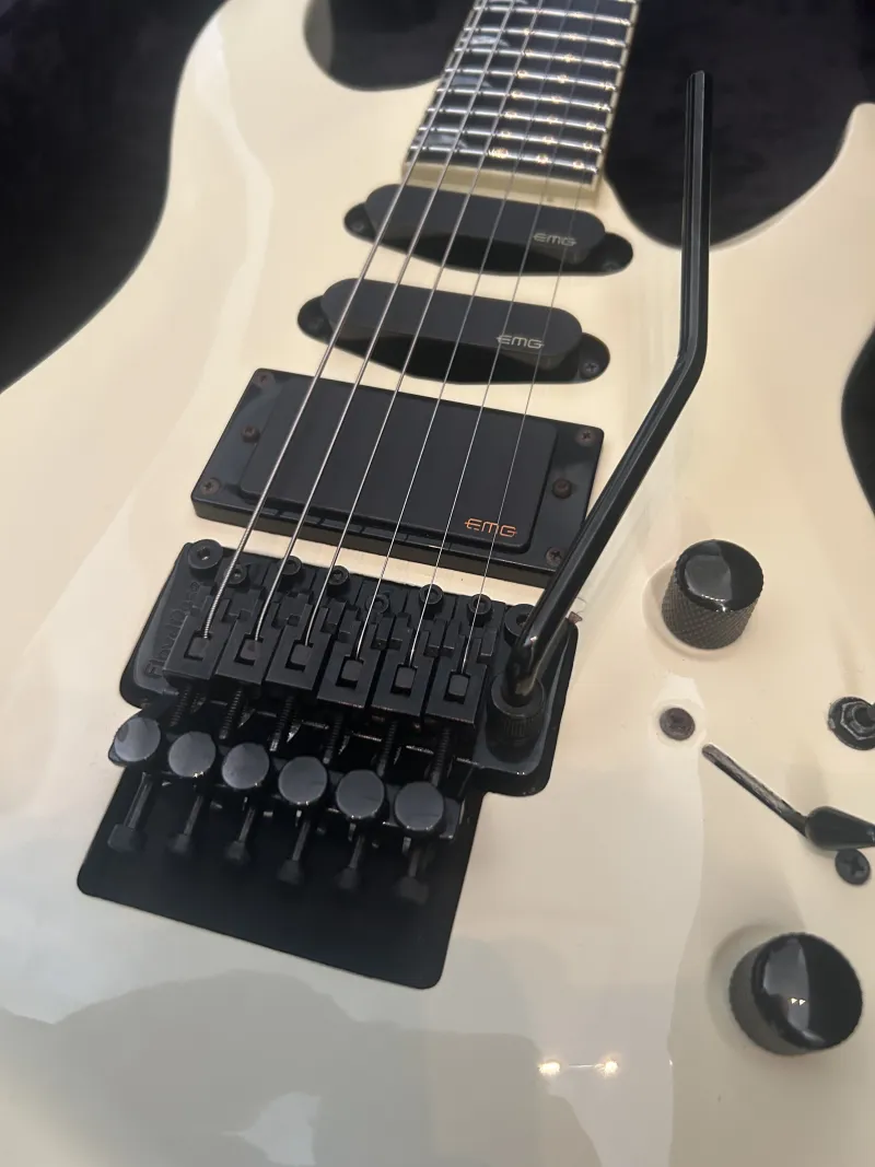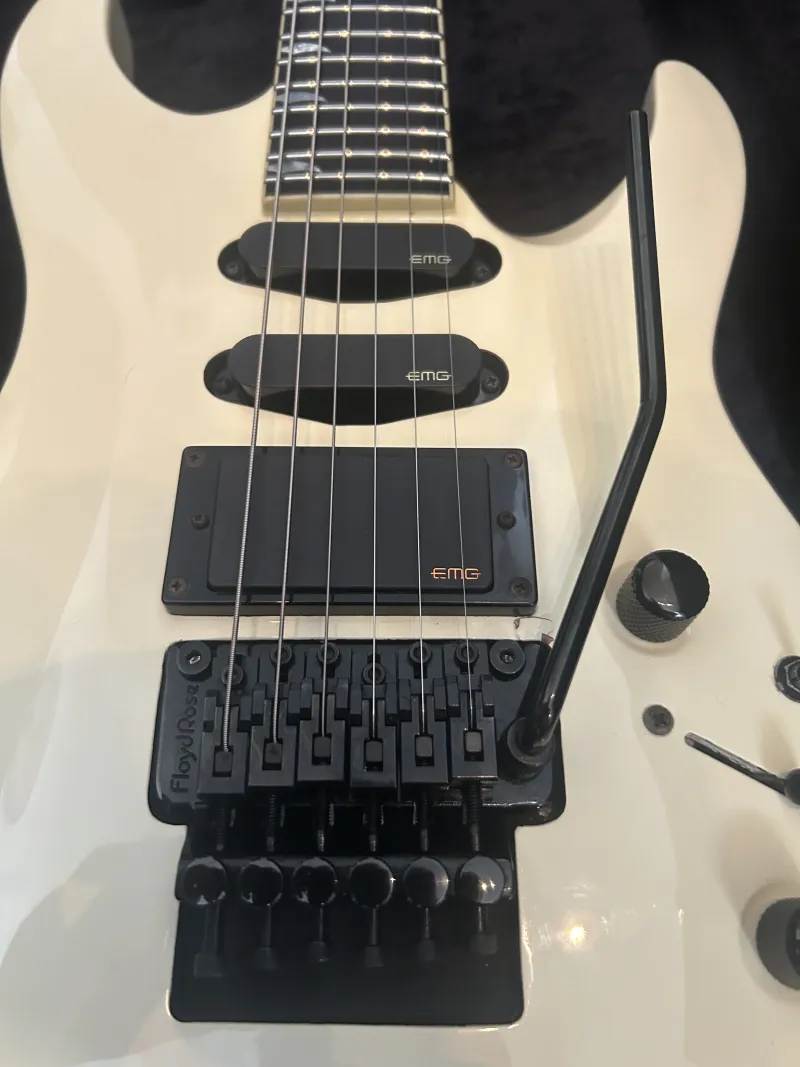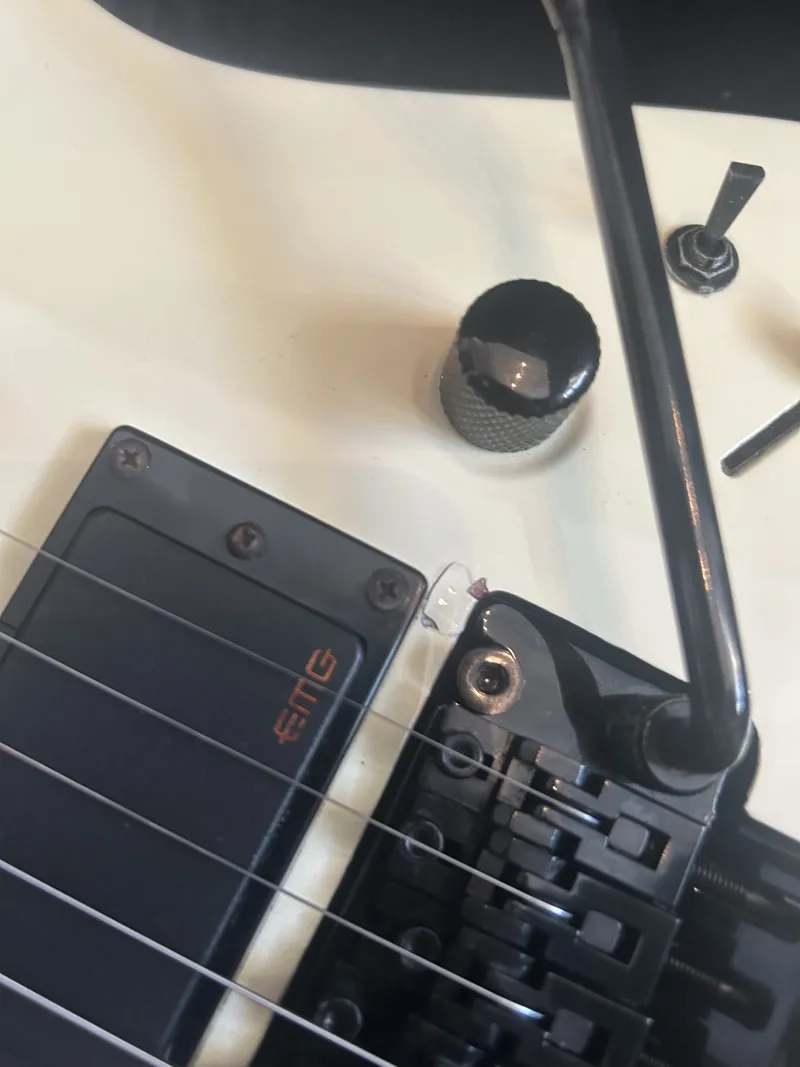 A képeken látható egy leverődés, ezt a Floyd Rose okozta, mert szerkezetileg a tőcsavar eltőrt és a híd felmarrta a lakkozást és a fát, ez azonban szintén javítva van, jól működik, a hiba ragasztva lett.