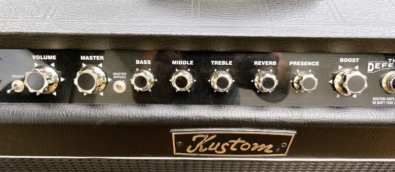- Volume, Master, Bass, Middle, Treble, Reverb, Presence, Bright kapcsoló és Master bypass kapcsoló