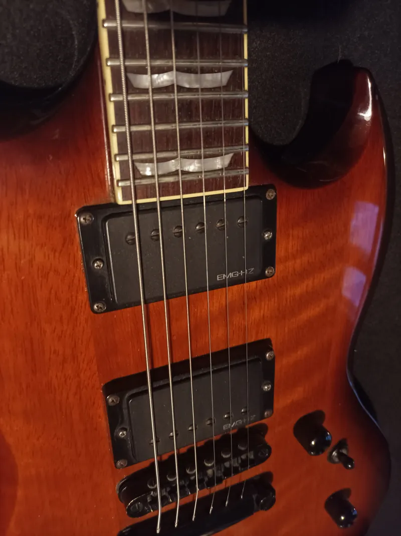 Eladó Viper 301, kényelmes vékony nyak, 24 extra jumbo bund, EMG hangszedők, 24 3/4˝ scale (Gibson, Epiphone húrhossz), 2002 Koreai gyártás, beérett hangszer!Jelenleg 11-es húrokkal drop H-ra hangolva.