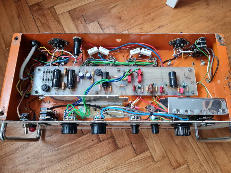 What could be kept original has remained (Power transformer, choke, FAQ switch, Treble and Bass potentiometers), everything else has been changed.