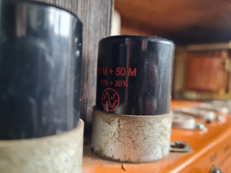 All capacitors, diodes, potentiometers (2 out of 4), resistors, sockets, wires, cables have been replaced. Two original potentiometers remain, as well as the bakelite switch.