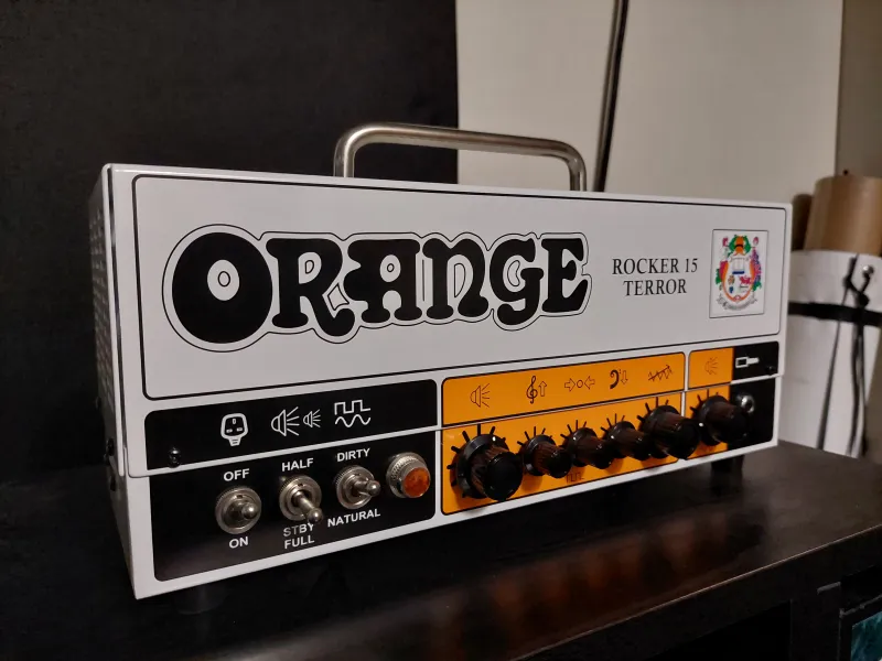 Október 4-én budapesti átvétel is lehetséges!Eladóvá vált ez a kiváló műszaki és esztétikai állapotnak örvendő Orange Rocker 15 Terror fullcsöves gitárerősítő fej, ajándék Orange lábkapcsolóval!