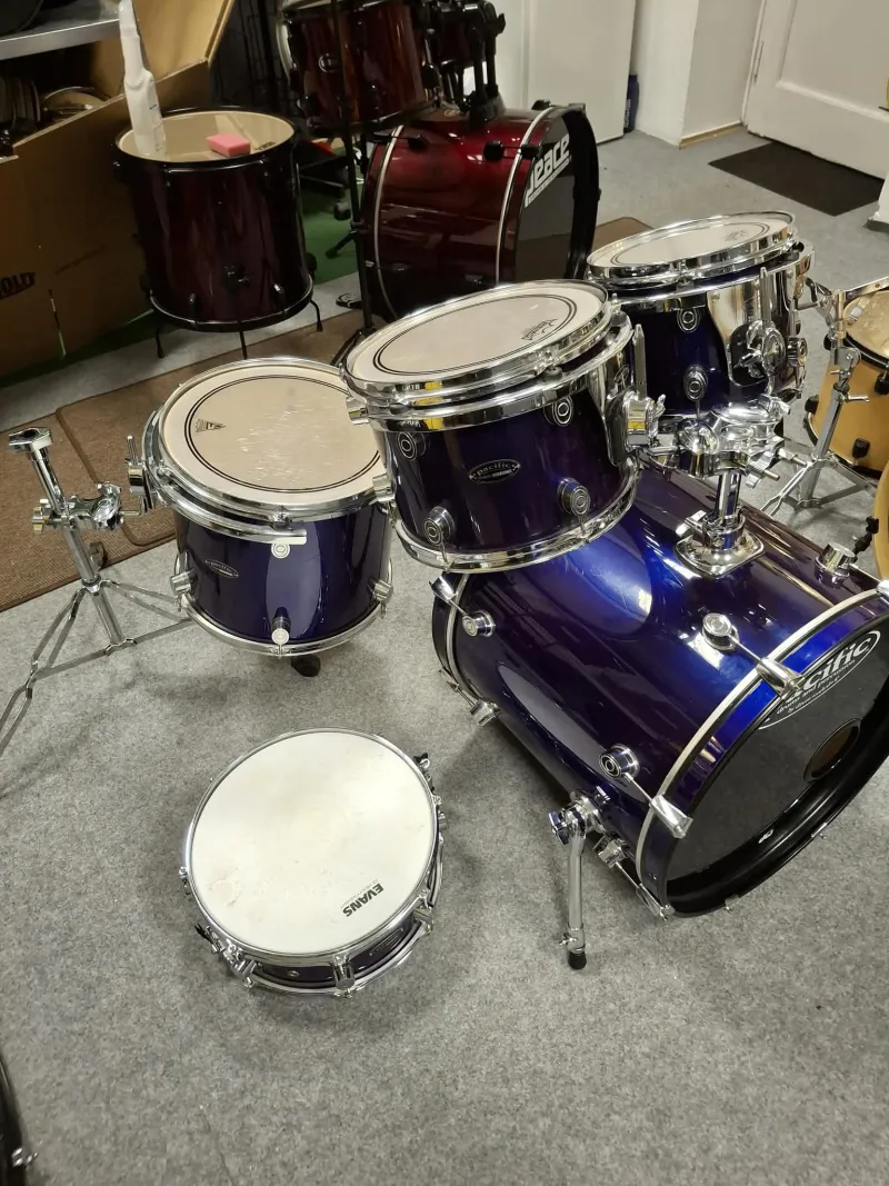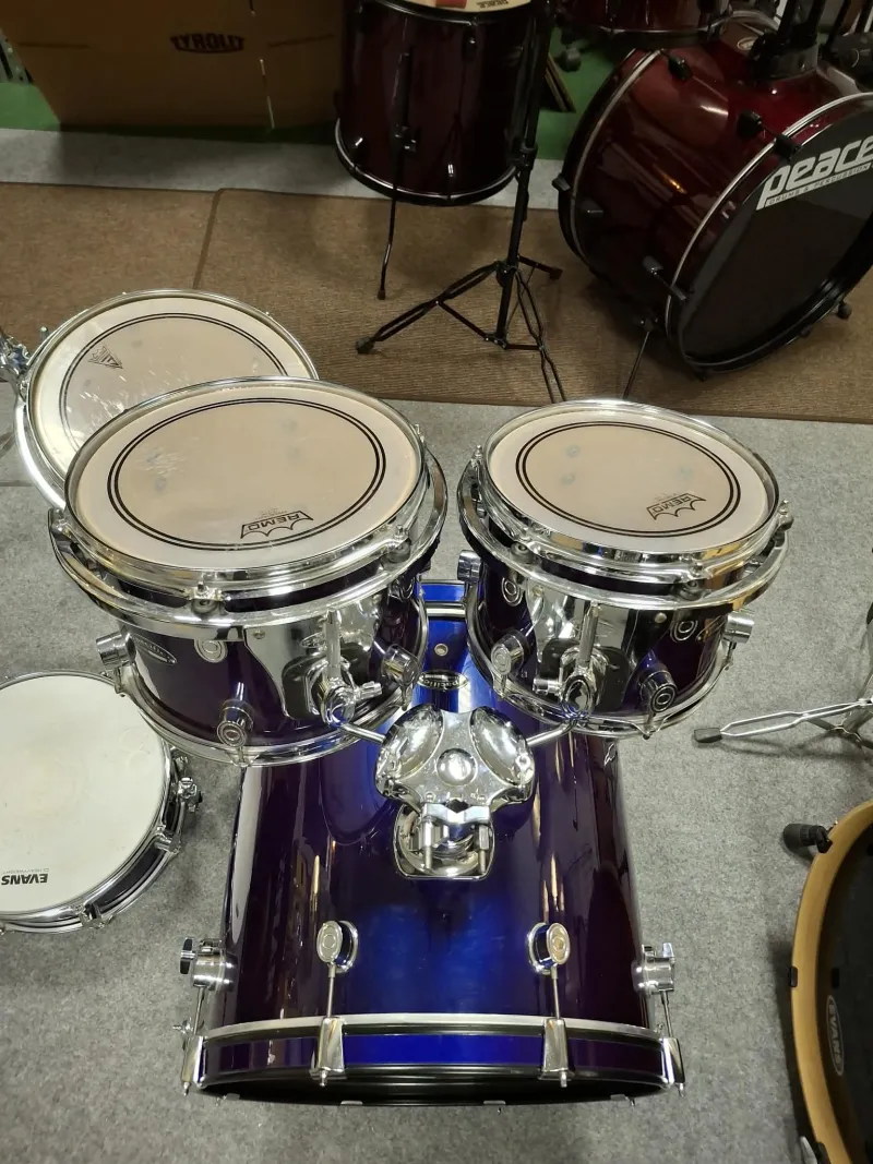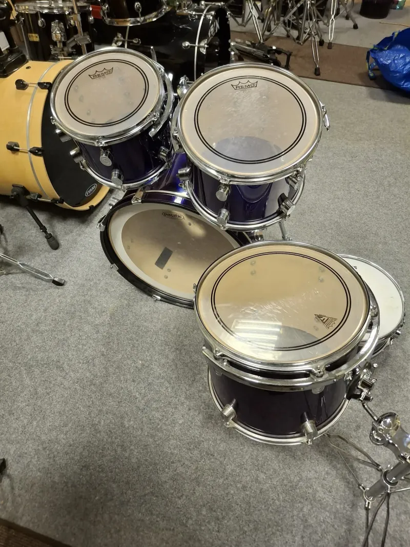 A tamok 10, 12 és 14-es méretűek. Mindegyik fúratlan külső felfüggesztéses. A lábdob a titkos fegyvere a felszerelésnek, mert 20x20-as és iszonyú nagyot szól! A Pergő 14-es 8 babás.