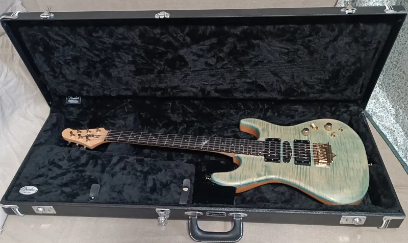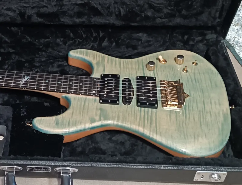 Minden porcikájában magas minőségű elemekből, egyedi megrendelésre, Prieger Tamás által készített gitár. 24,8 col menzúra, 24 érintő. Csavarozott juhar nyak, ébenfa fogólappal, gyöngyház pozíció jelölőkkel. Éger test, mintás jávor toppal. A test lakkozott. A nyak hátoldala lakkozatlan, olajos méhviaszos felületkezeléssel, ami selymes tapintást kölcsönöz a nyaknak. Húronként állítható réz felső nyereg. Különleges arany Trem-King tremoló, fix görgős papucsokkal ( játék közben rá lehet támaszkodni ) csak az alsó tőke fordul el. Arany PRS mini locking kulcsok, ébenfa gombokkal. Szögletes bobbinú PRS hunbuckerek. Nyaknál Vintage Bass, hídnál HFS. Középen egy SSL-1 Seymour Duncan egytekercse hangszedő. Az elektronika két pusg-push potit, két háromállású mikro kapcsolót és egy 3 állású pu váltót tartalmaz. Alapvetően egy klasszikus két humbuckeres gitár, háromállású pu váltóval áll rendelkezésre. Az egyik mikro kapcsolóval lehet az SSL-t ki-be kapcsolni, így lehetőség van arra, hogy csak a középső SSL szóljon, vagy együtt menjen a humbuckerekkel, illetve üzemen kívül maradjon. A másik micro kapcsoló - szintén három állással - a humbuckereket felezi. Közép állásban mindekét tekercs szól, a kétz szélsőben pedig vagy az első vagy a hátsó szól. A hangszín potival a híd hangszedő fázis fordítását lehet előhívni. A hangerő poti felső állásban a híd hangszedő a hangerő potit megkerüli, így csak a nyaki pu hangereje lesz szabályozható. Kiváló, sokoldalú hangszer. Testhez igazított Fender kemény tok is tartozék.Shipping