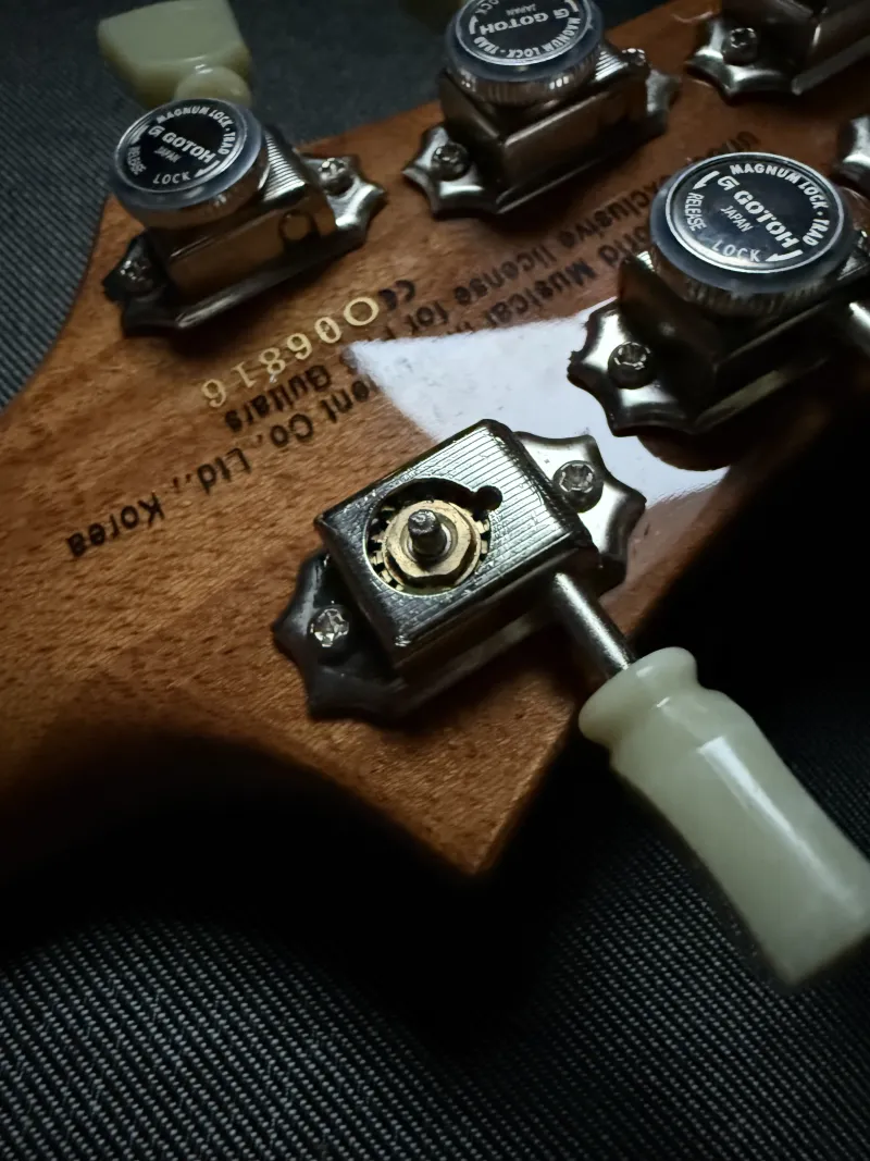 !(FONTOS: a vastag E húr kulcsának satutekerentyűje sajnos a kezemben maradt így az hiányzik. A gitár húrozható és tartja ettől függetlenűl a hangolást. A hangszernek ezen kívűl nincsen más problémája)!