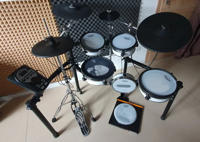 Nagyobbra szettre váltás miatt eladó egy komplett Padtech elektromos dobszett, Roland TD-11 dobmodullal (kiegészítő hangcsomaggal), 2db 8˝, 2db 10˝-os hálóbőrös ütőfelülettel, 1db szintén hálóbőrös lábdobbal + 1db tartalék 10˝ hálóbőrrel, valamint lábcin állvánnyal, Padtech PA-6R lábcin vezérlővel, 1db 8˝ splash tányérral, 1db 12˝ kétzónás beütővel és 1db 16˝ 3 zónás kísérő tányérral. A tányérok mind gumi felülettel rendelkeznek. Igény esetén tudok hozzá adni egy Mapex Tornado pedált is. Dobszéket nem tartalmaz a csomag.
