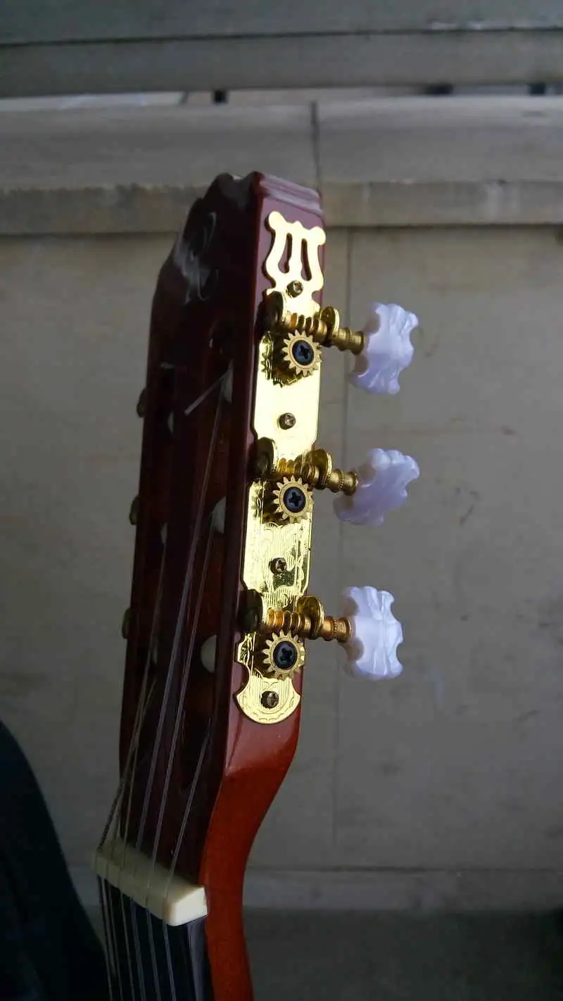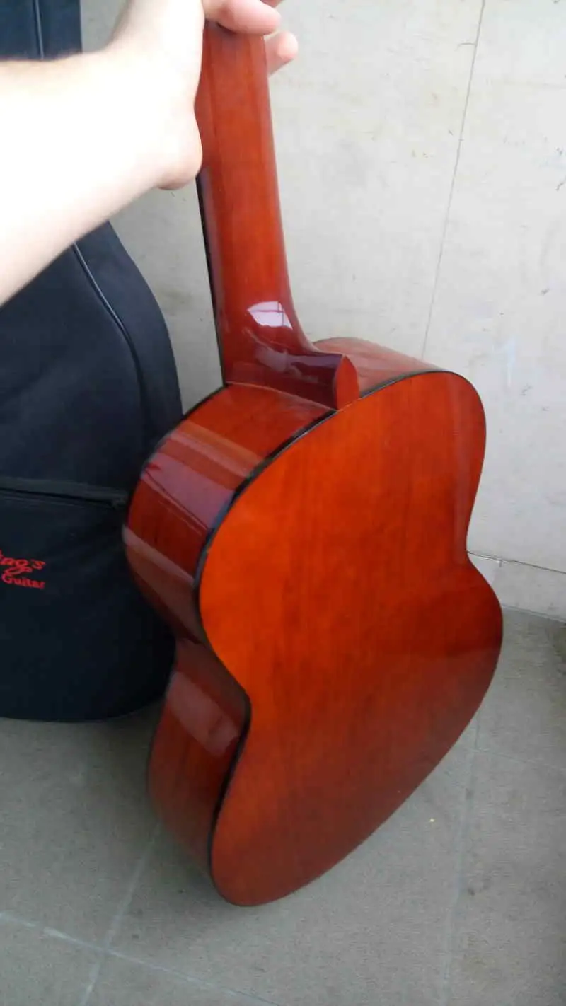 I bought the guitar several years ago, and it was always kept in its case when not in use. Its finish is still flawless today, with only minor wear visible on the headstock, and only up close (scraped against a wall, only visible as shown in the picture - almost not at all). I replaced the strings last year, and it has barely been used since, because we got an acoustic Cort (this is the original reason for selling).