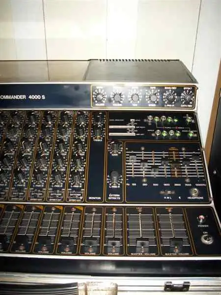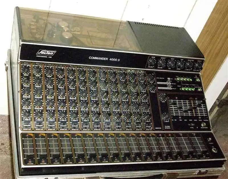 huendeskesThe SOLTON Commander 4000-S 12 microphone or line channel power mixer shown in the picture is for sale, in perfect working condition. 2x150W + 100W for control, 6 speaker outputs / 4-16 Ohm/, built-in tape echo and spring reverb. 2-band EQ per channel + 7-band master EQ, effects loop, line out, record mode / DIN/. The EQ and effect are switchable per channel. The control output has a separate 2-band EQ.