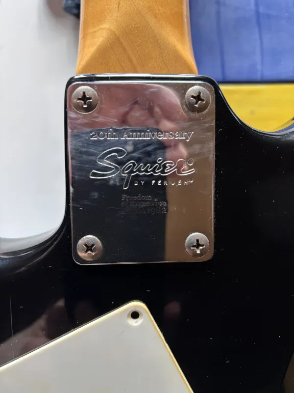 For Sale: Black Squier 20th Anniversary Affinity Stratocaster with a rosewood fingerboard - a feature no longer available on current Affinity models.