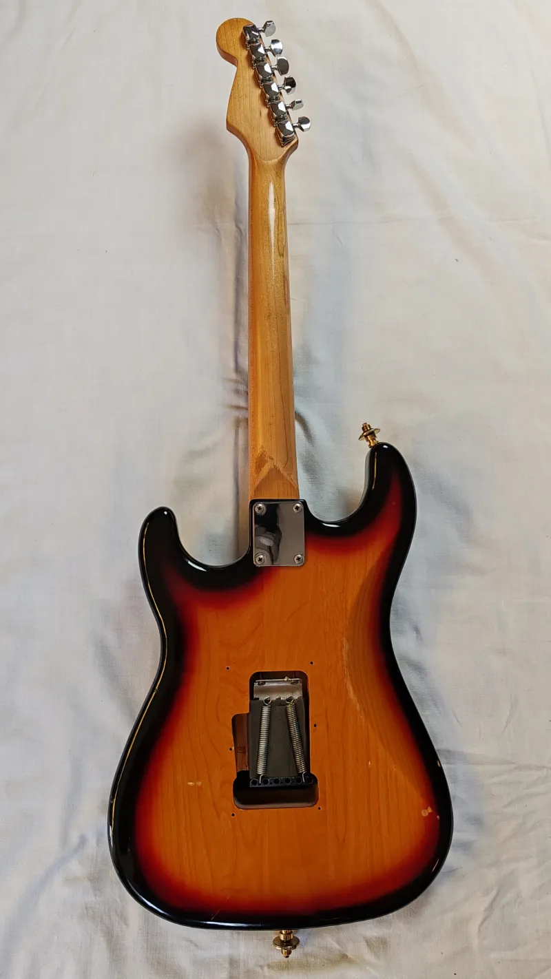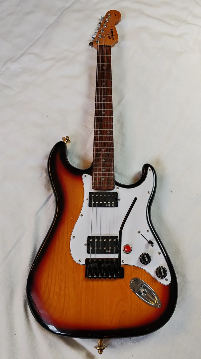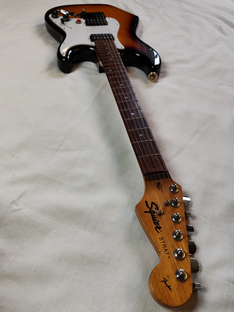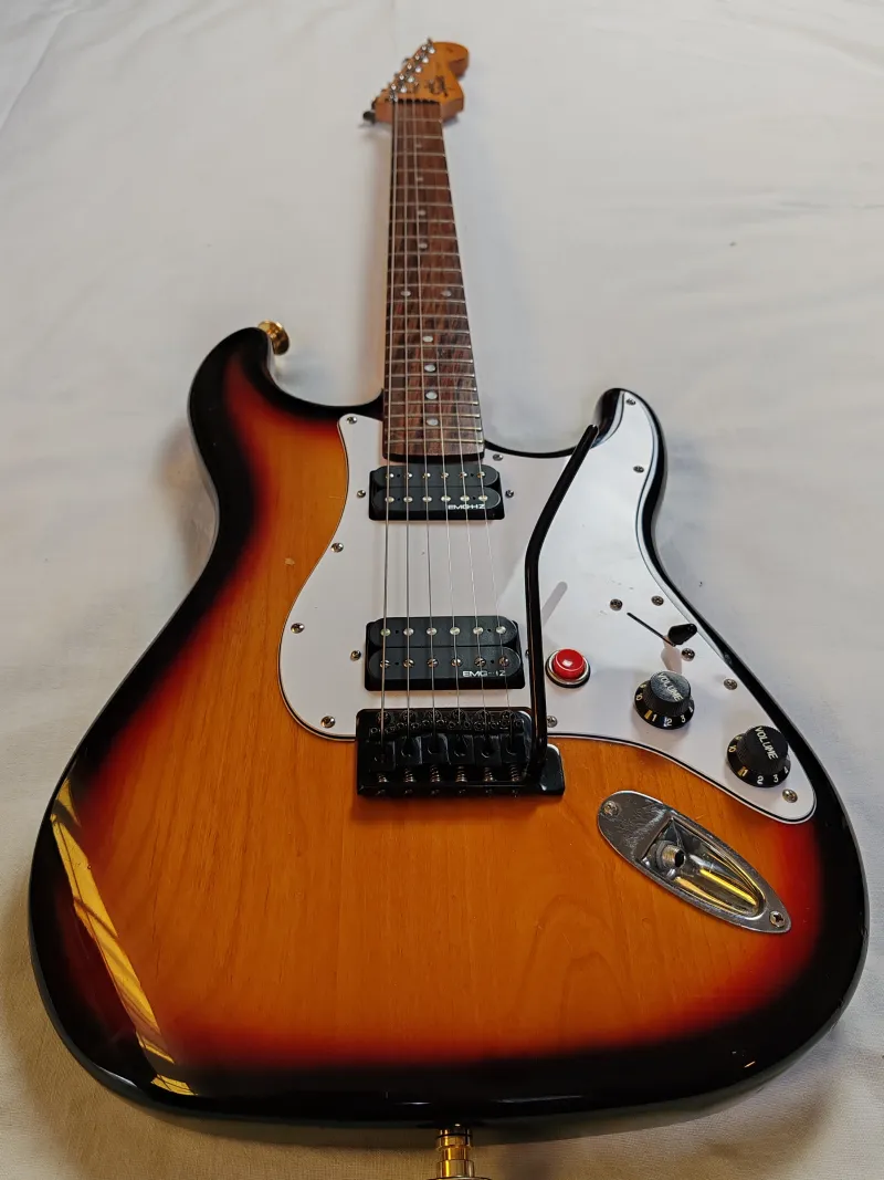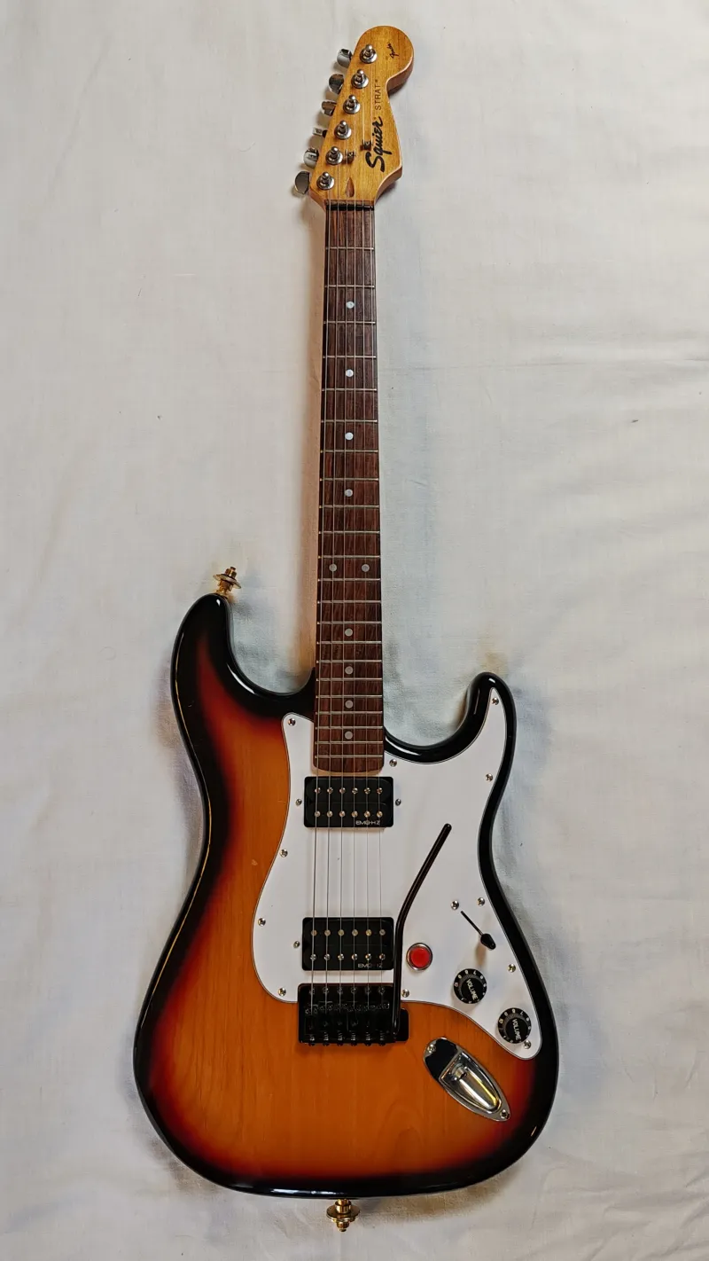Eladó ez a vélhetően kilencvenes évek közepén készült, erősen moddolt, tuningolt Squier Strat. Mivel annak idején csere útján került hozzám, sokat nem tudok róla, de a fejen látható feliratok és a hangolókulcsok alapján 1995-1996 körül gyárthatták Taiwan szigetén, legalábbis online kutatásaim alapján ez a legvalószínűbb. Elég sok mindent kicseréltem rajta, alapvetően projekt gitár volt, majd lett belőle egy olcsó, de sok mindenre alkalmas igásló, amit viszont más hangszereim mellett jelenleg alig használok.Szín: sunburst