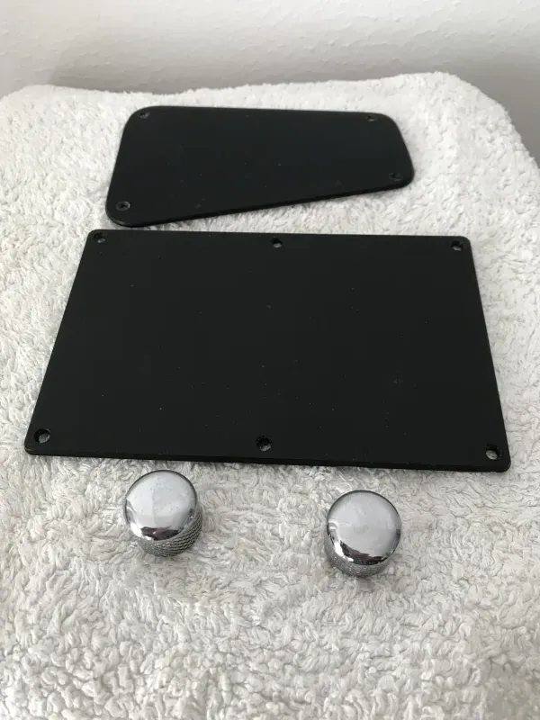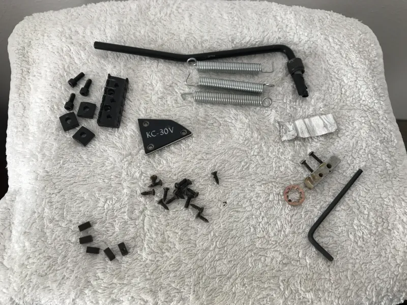 Minden kellék meg van, kivéve a fent említett javasolt cserére tremoló hídi satú E6 kis szoritója. De szerencsére a golyónál is le lehet rögzíteni a húrokat.