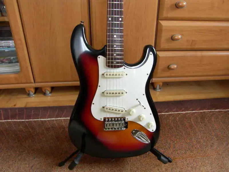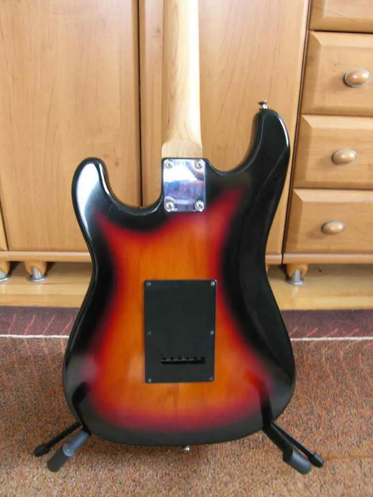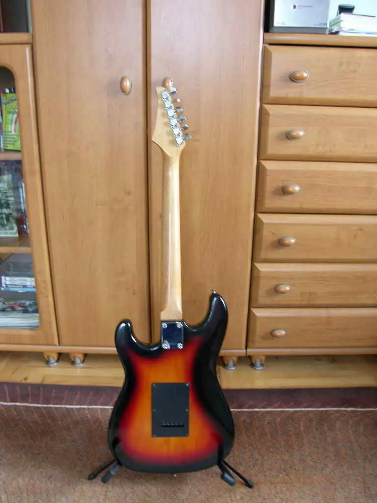 Configuration: S-S-S pickups, 5-way switch, 1 vol, 2 tone, 21 frets, vintage tremolo, 3-tone sunburst color. Used, but in good condition, recently set up (neck, octave, low, but not buzzing string action).