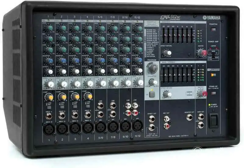 Yamaha Emx 512 SC: mixer amplifier: 2 x 500 Watt power, 8 channels (4 microphone, 2 microphone/stereo jack, 2 microphone/stereo RCA), compressor, treble, middle, bass adjustment, monitor and effect potentiometer, feedback indicator LED, 16 built-in effects, 7-band graphic EQ, Stand by switch, weight: 10 kg, dimensions: 442 x 264 x 286 mm