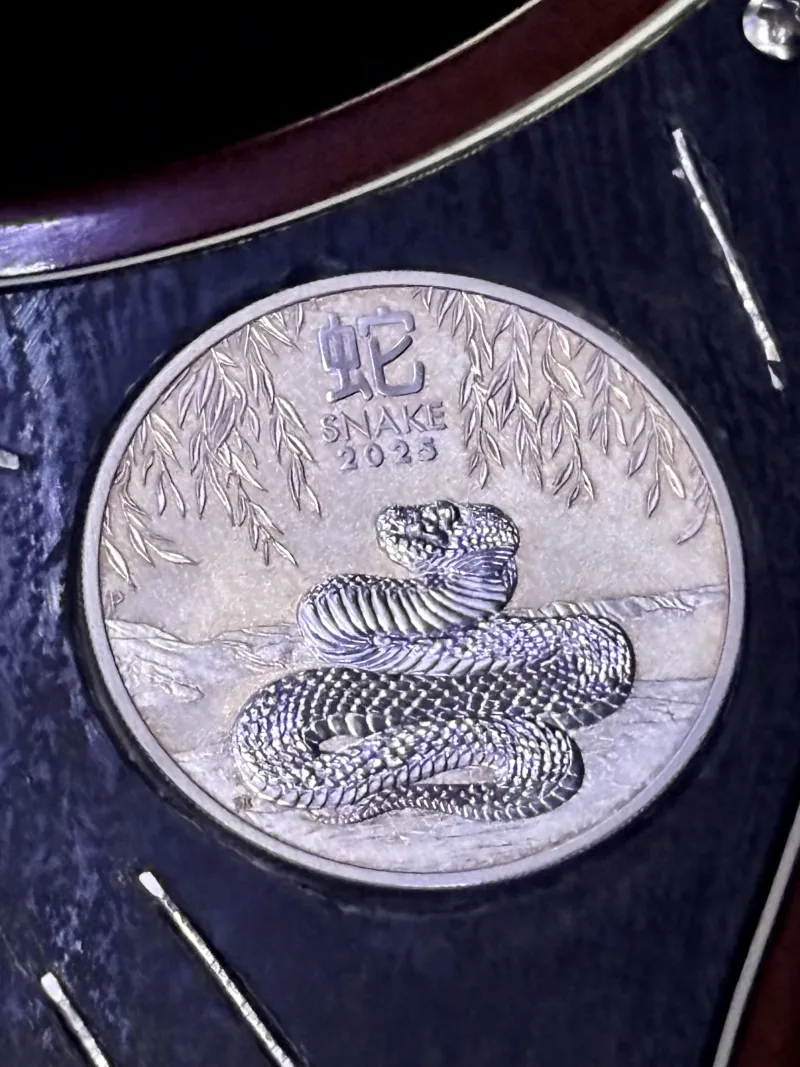 * Koptató: teljesen egyedi, díszítve egy 2025-ös, 1 unciás színezüst éremmel (kígyó motívum), valamint kalapált ezüst szálakkal