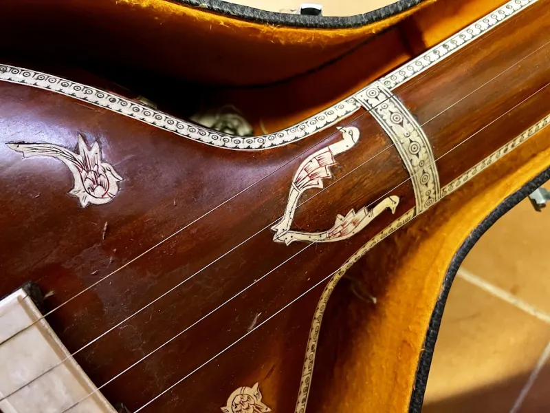Eladó egy régi, eredeti indiai tanpura, tök rezonátoros kivitelben.A hangszer kézzel készült darab, szép berakásokkal, hagyományos jawari híddal.