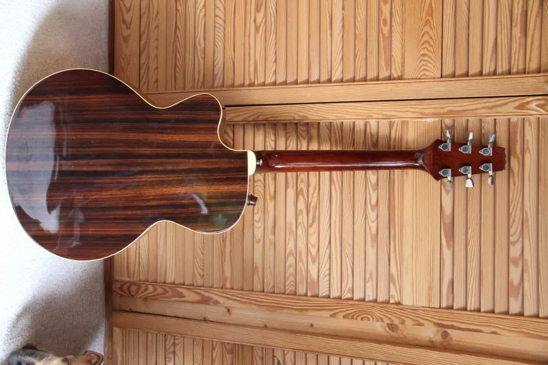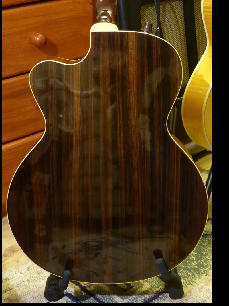 1980 ARIA Elecord AE-90 japán elektroakusztikus, jazz gitár.Domború fedlappal és hátlappal készült piezzo elektromos gitár, jazzgitár. A gitár nyakán a fej alatti repedés szakszerűen javítva lett, ahogy ez a képeken látható. A nyak új bundokat és új 12-es Thomastic köszörült húrokat kapott. A húrok magassága a 12. pozícióban: E1: 1,25mm, E6: 1,5-1,75mm. A gitár fedőlapja lucfenyőből, oldal és hátlapja rózsafából, a nyak mahagóni, a fogólap rózsafából készült. A hangerő és hangszín gombokkal vezérelt aktív piezzo elektronika eredeti, gyárilag szerelt. A gitárnak akusztikusan tiszta, kiegyenlített, a hozzáadott Kent Armstrong hangszedővel meleg, telt jazz hangzása van.