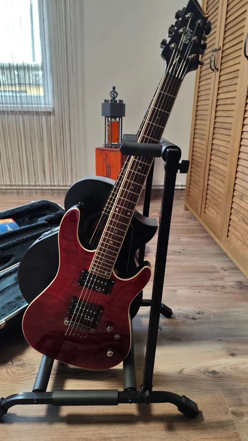 Eladom vagy basszus gitárra cserélem ezt a szép Cort KX1Q BC elektromos gitárt. Tizes Elixir húrral beállítva. A gitár: ragasztott nyak, menzúra: 25.5˝ (648 mm), mahagóni test, habos juhar fedlap, mahagóni nyak, rózsafa fogólap, gyöngyház pont berakás, EMG-HZ OPEN SA1 (F) / TB1 (R) (h-h) hangszedők, hangerő, hangszín (push/pull), 3-állású pickup kapcsoló, fekete nikkel szerelékek, TonePros lic. Locking (C-TPFP) húrláb, testen átmenő húrok, Die-Cast hangolókulcs, 24 Large érintő, cseresznye szín (BC: black cherry) Békéscsabán lehet megnézni, kézbevenni, kipróbálni.Reseña relacionada