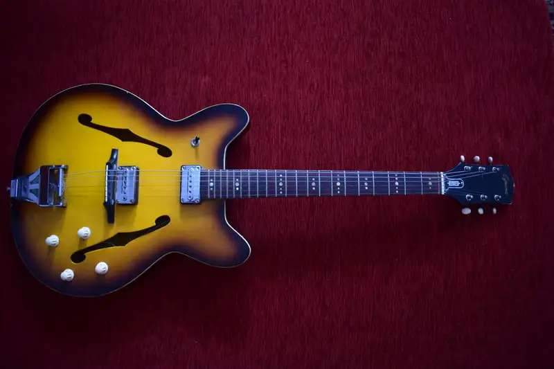 Guitarra Egmond 7 Hollow Body de 1965, muy desgastada y usada debido a su edad, pero en perfecto estado de funcionamiento.