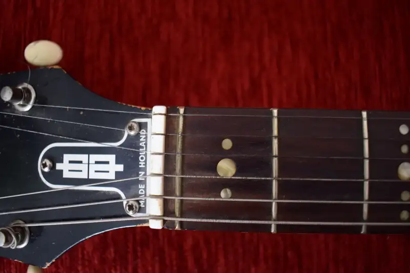 Lamentablemente, faltan el golpeador y la palanca de trémolo, y el mástil puede haber sido reencolado y atornillado en algún momento debido a un daño antiguo.