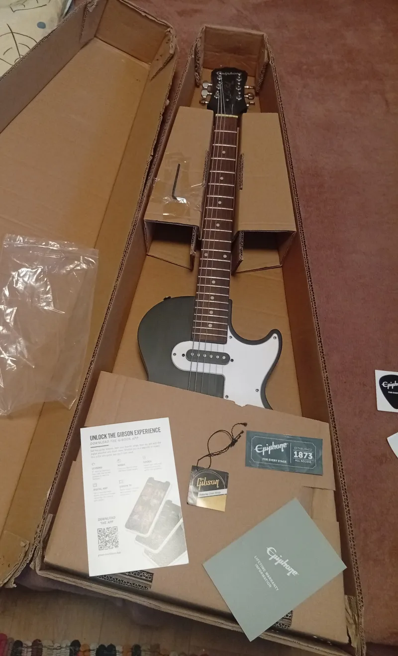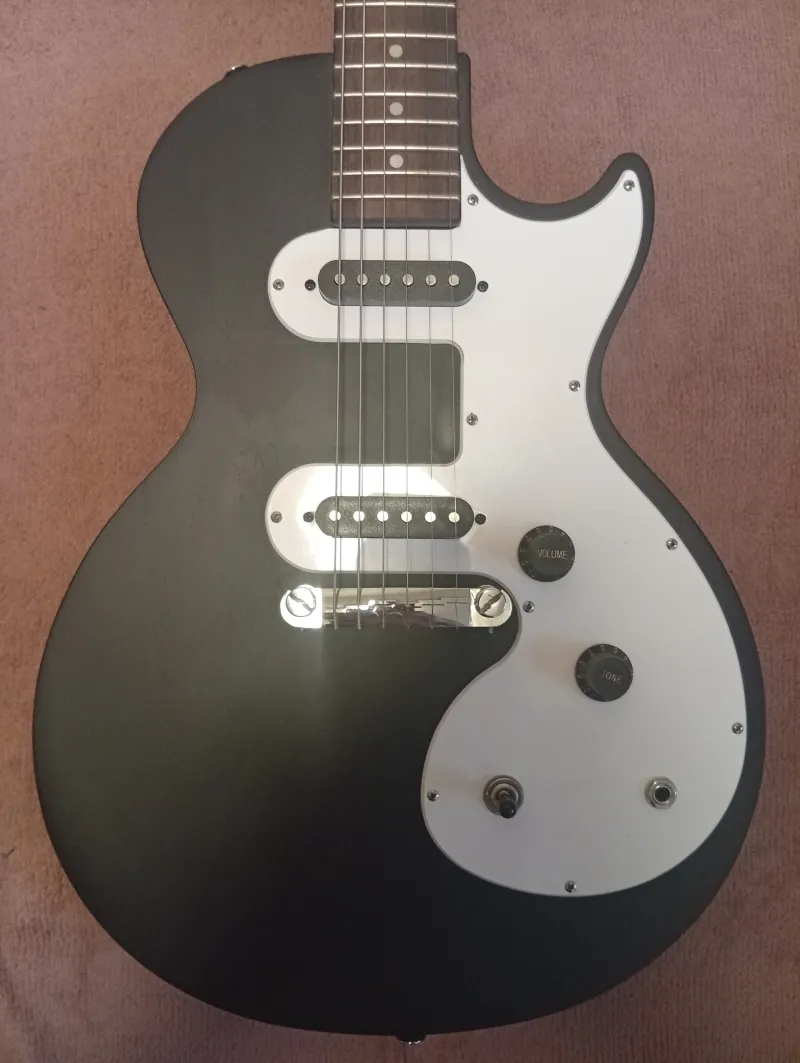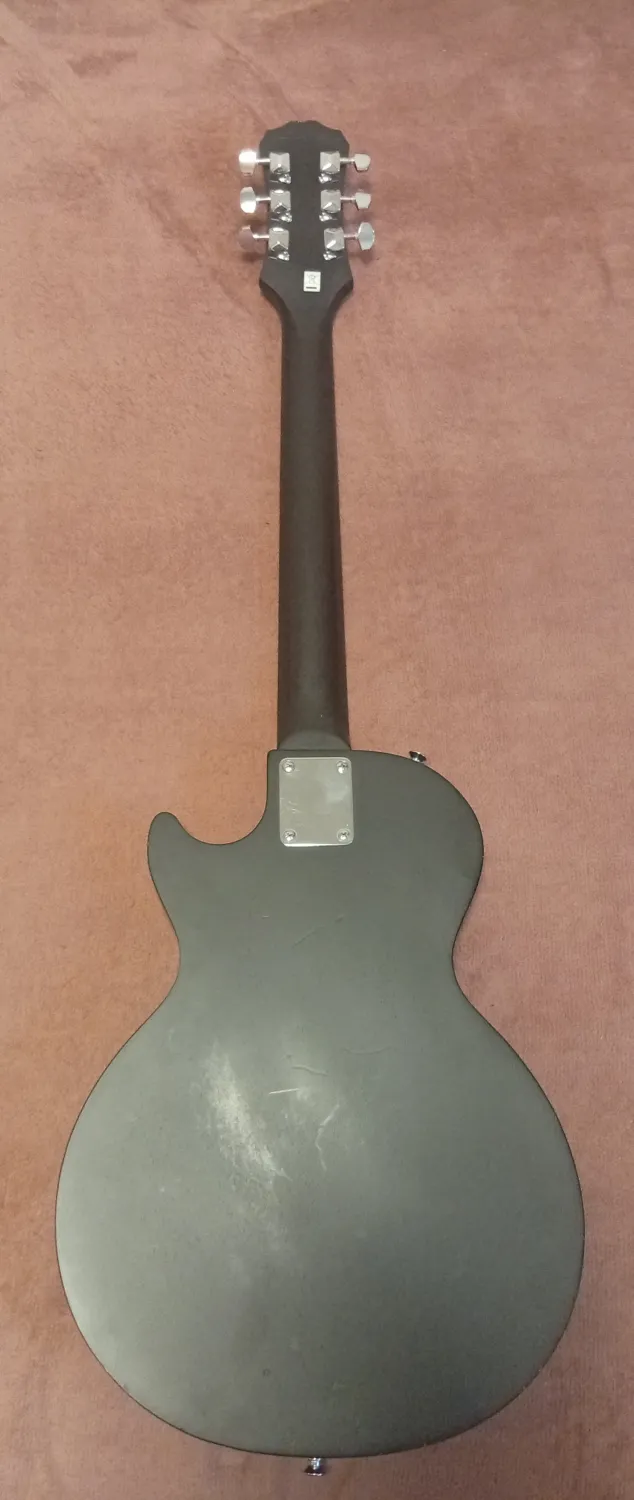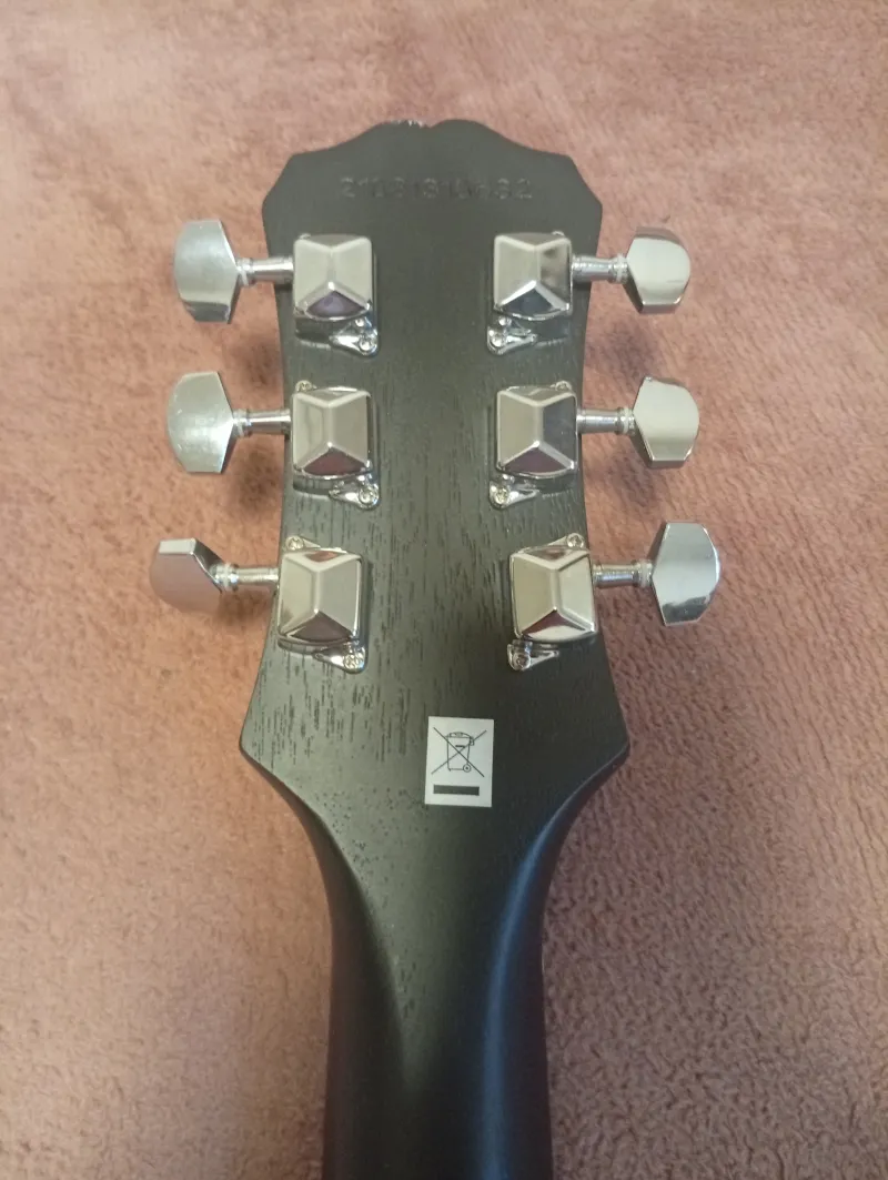 Elektromos gitár, Les Paul SL széria. Nyárfa test, 1960`s SlimTaper-D alakú mahagóni nyak, rózsafa fogólap 22 Medium Jumbo éritnővel, sugár: 12, menzúra: 24,75 (65,024 cm), szintetikus csont felső nyereg 1,687 ``(42,85 mm). Krómozott hardver, Intonated Wrap Around Stopbar Combo húrláb, Premium Covered mechnaika, 14: 1 arányban. Két single-coil hangszedő: Epiphone 650SCR Ceramic Single-Coil a nyaknál és Epiphone 700SCT Ceramic Single-coil a húrlábnál. Master Volume és Master Tone pontméterek, 3 állású kapcsoló. Szín: Fekete