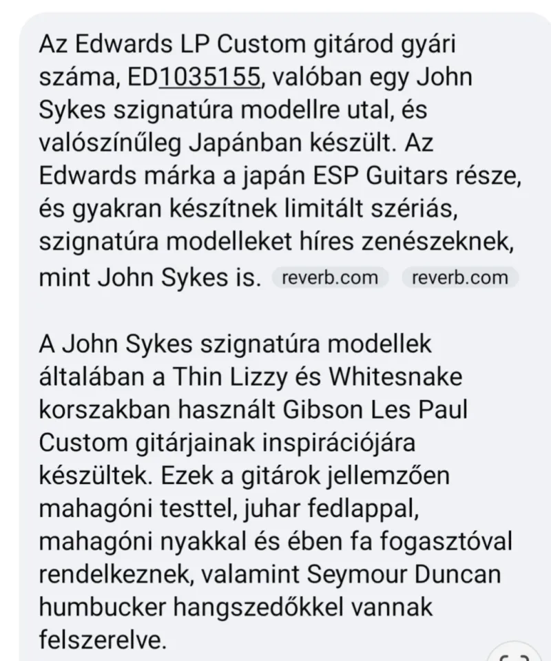 Eladó ez a Japán Esp by Edwards John Sykes szignatúra Les Paul custom gitár,amely 100% ban japán ESP gyártás ,én ebben sosem kételkedtem,de a gyári szám megadása után a mesterséges inteligencia is ezt támasztotta alá,melyet a képeknél mellékeltem.Súlya 3,7kg.Minden cróm tartozék és a képeken látható összes hardver jár a gitárhoz ,plusz koffer is.Az eredeti Seymour fekete pickup szett viszont nincs már meg. Jelenleg fekete szerelvényekkel van,ahogy az első fő képen látod.Gibson 490/498 szett van benne,de hangszedők nélkül olcsobban is vihető!A görgős híd nem tarzék ,ABR - Gotohal adom,vagy is a gyárival,de ha nem alkudozol azt is adom.a gitárral!A leg tökéletesebb választás,ha nem akarsz két milliót adni egy Gibson customért.Nálam az is van,össze hasonlíthatóak.Csak is azért eladó mivel hosszú vajúdás után megvásároltam az USA Gibson lp customot,igy feleslegessé vállt,viszont hangban nem mard el az USA nagy tesótól,kidolgotasban meg sokkal precízebb.Gibson sg standard csere érdekelne, illetve valami jó vonalas multi effekt,de inkább felső karegóriás ami profi szintű vonal hangosítást biztosít nagy szinpadi fellépéseknél is ,esetleg súdióban is !Csak személyes átvétel működik itt Sopronban Bár mi más kérdésre szívesen válaszolok.Reseña relacionada