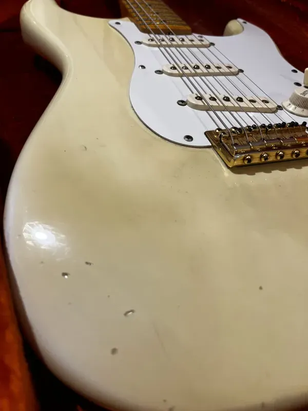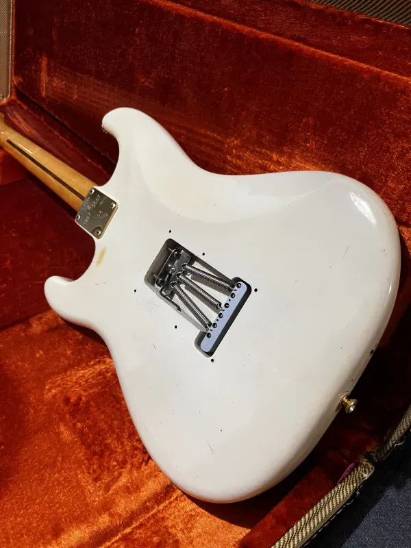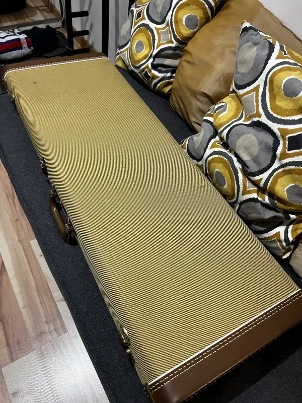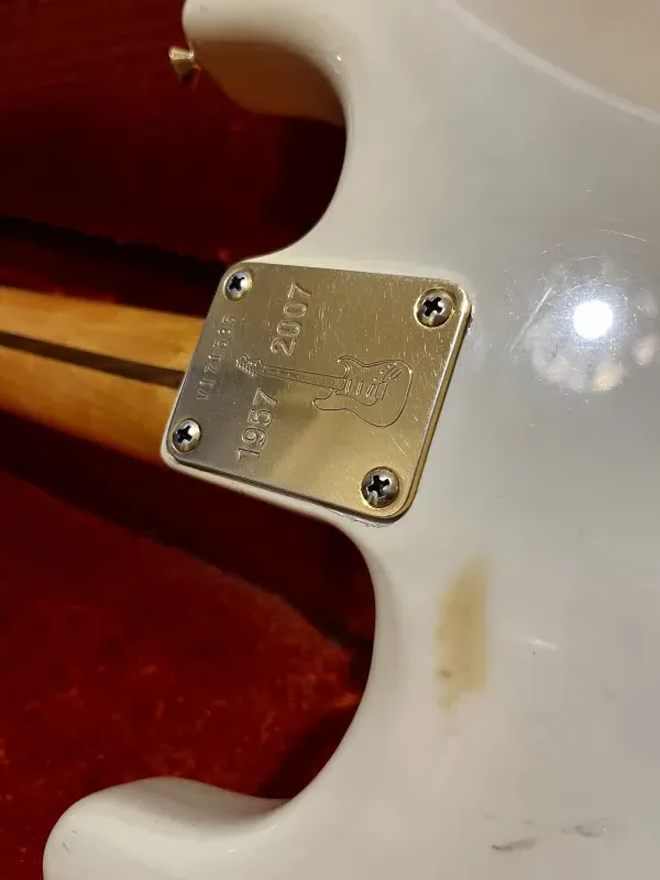 Fender American Vintage 57 50th Anniversary Commemorative Mary Kaye Stratocaster eladó. 2007-es évjárat, jubileumi kiadás, gyönyörűen megsárgulva korához képest, arany szerelvényekkel, saját tweed tokjában, papírjaival, alkatrészeivel.