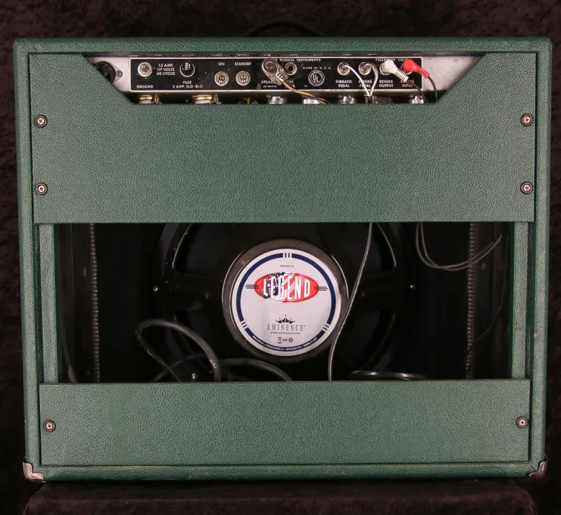 huenFender Super Reverb 1965-1967 közötti (nem reissue), ami gyárilag 410 volt, de most 1x15, Eminence Legend 15 hangszóróval. Készített fender doboz, zöld tolex-szel.