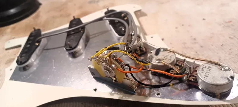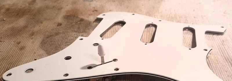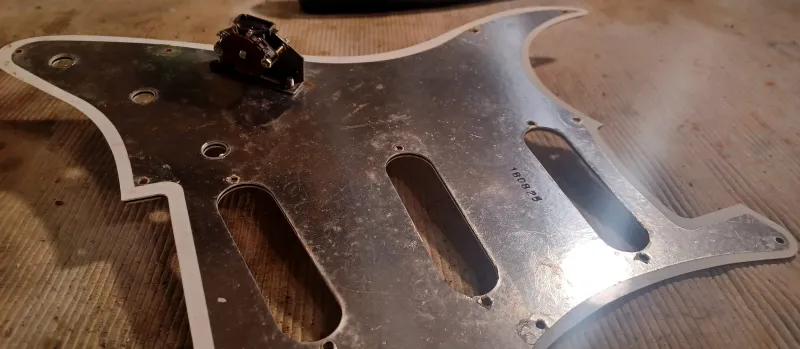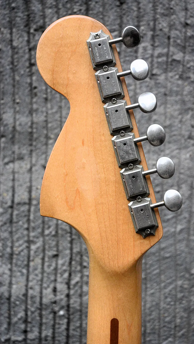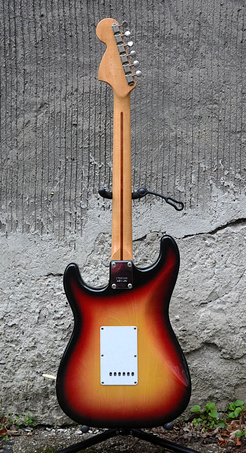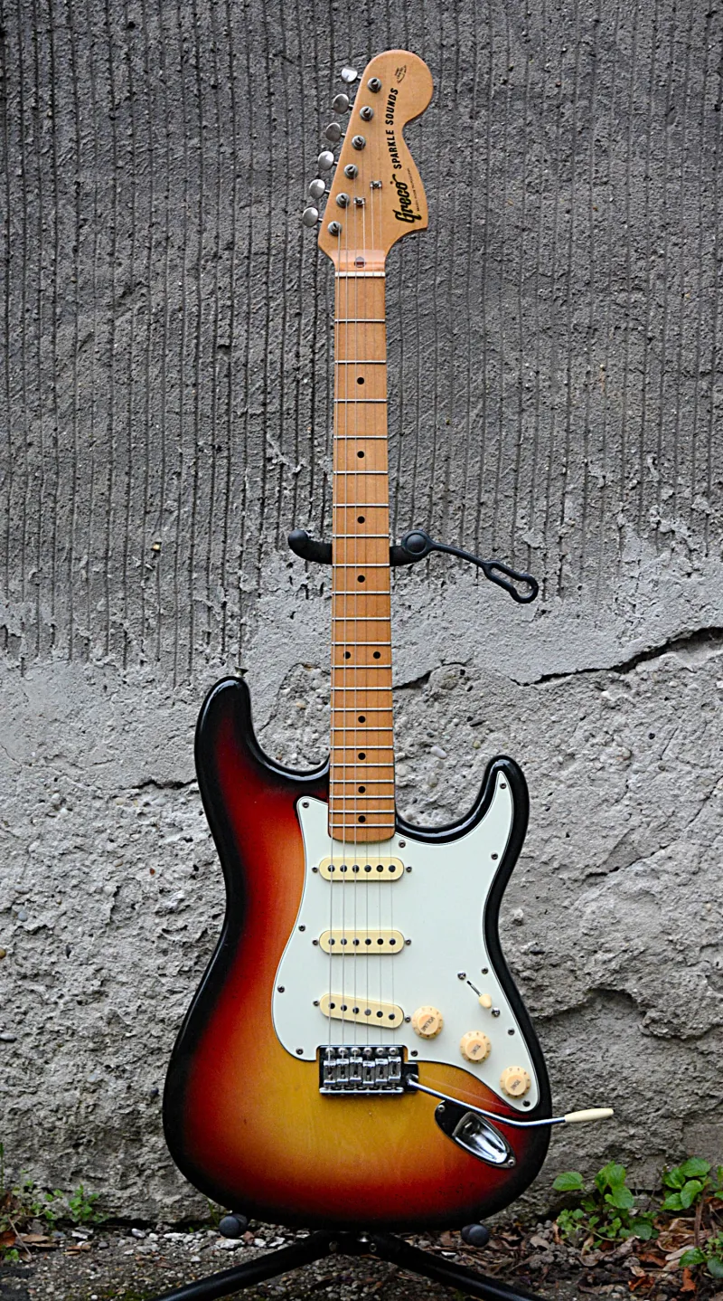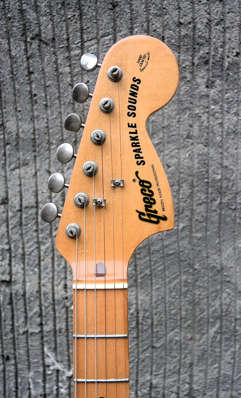 Greco SE-600 Sparkle Sounds Stratocaster (Made in Japan 1978) nem csak korához képest kiváló állapotban, frissen újrabundozva,, új Elixir Optiweb 9-46-os húrokkal. Kőris test, jávor nyak, mindene gyári, kivéve a mint green koptató és a pickup kapcsoló. Ugyanis a korai Fenderekhez hasonlóan ebben is 3-állású kapcsoló volt, ám azt kicseréltem egy 5-állású Fender kapcsolóra. Ehhez ki kellett cserélni a koptatót, mert az eredetibe nem fért bele az 5-állású és nem akartam szétgányolni. Így viszont jár a gitárhoz az eredeti koptató, az eredeti kapcsolóval, vagyis ha valaki ragaszkodik hozzá könnyedén visszaalakítható az ősállapot. A koptató cseréhez nem fúrtam új csavarlyukakat. Olyan koptatót használtam, amin eredetileg nem voltak furatok és a koptatót igazítottam a test furataihoz.
