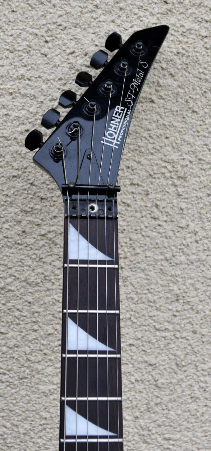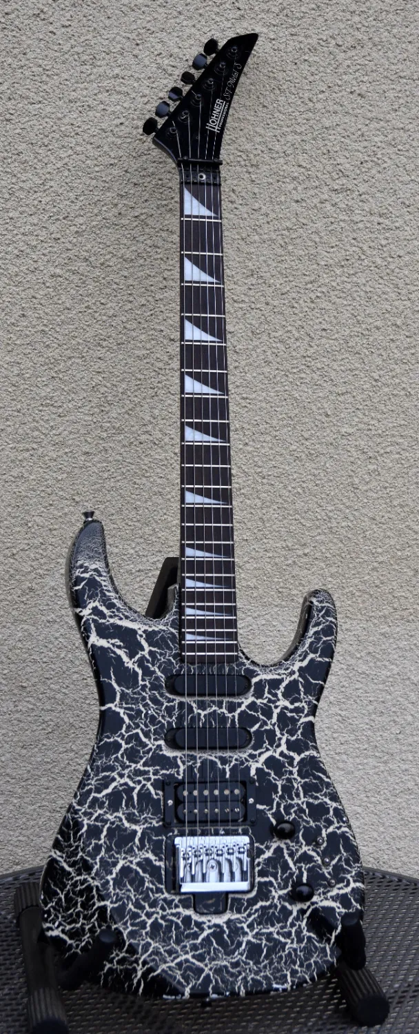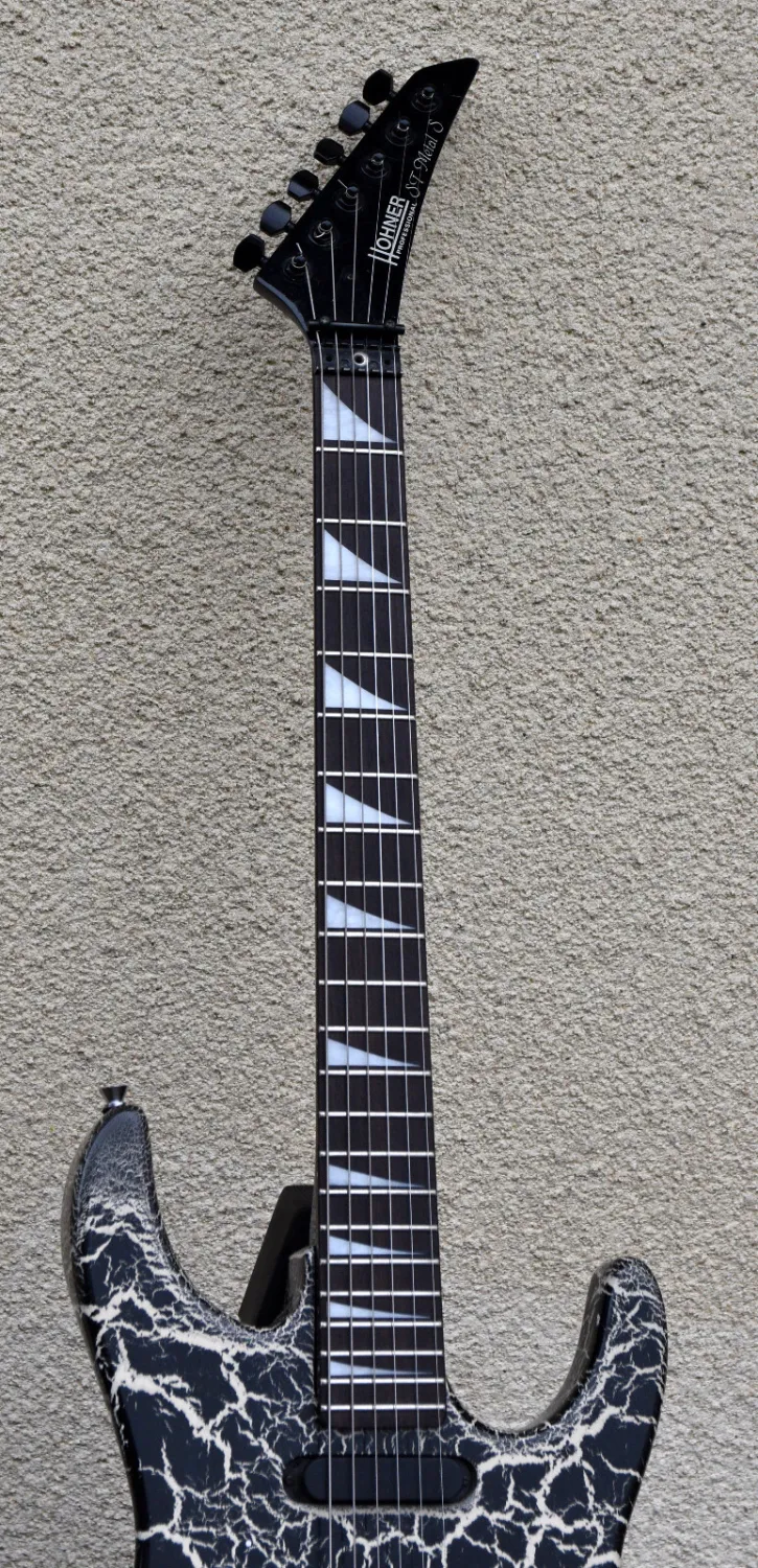 Eladó egy Hohner Professional ST Metal S elektromos gitár nagyon menő repedt fekete-fehér színben.A Hohner egyik csúcsmodellje volt ennek megfelelő árcédulával (1190 DM), 1986 és 1990 között készült Koreában.