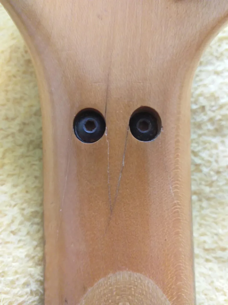 A nyaknál 2 mélyebb karistolás nyom van olyan 2-3 cm hosszban, ami már akkor ott volt, amikor 1996-ban megvásároltam. Anno megvizsgáltattam hangszerésszel, ő megnyugtatott, hogy ezek nem repedések és soha semmi bajom nem is volt elhangolódással, gyönyörű tisztán hangolható és hangolásban maradó hangszer.