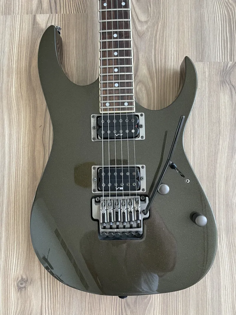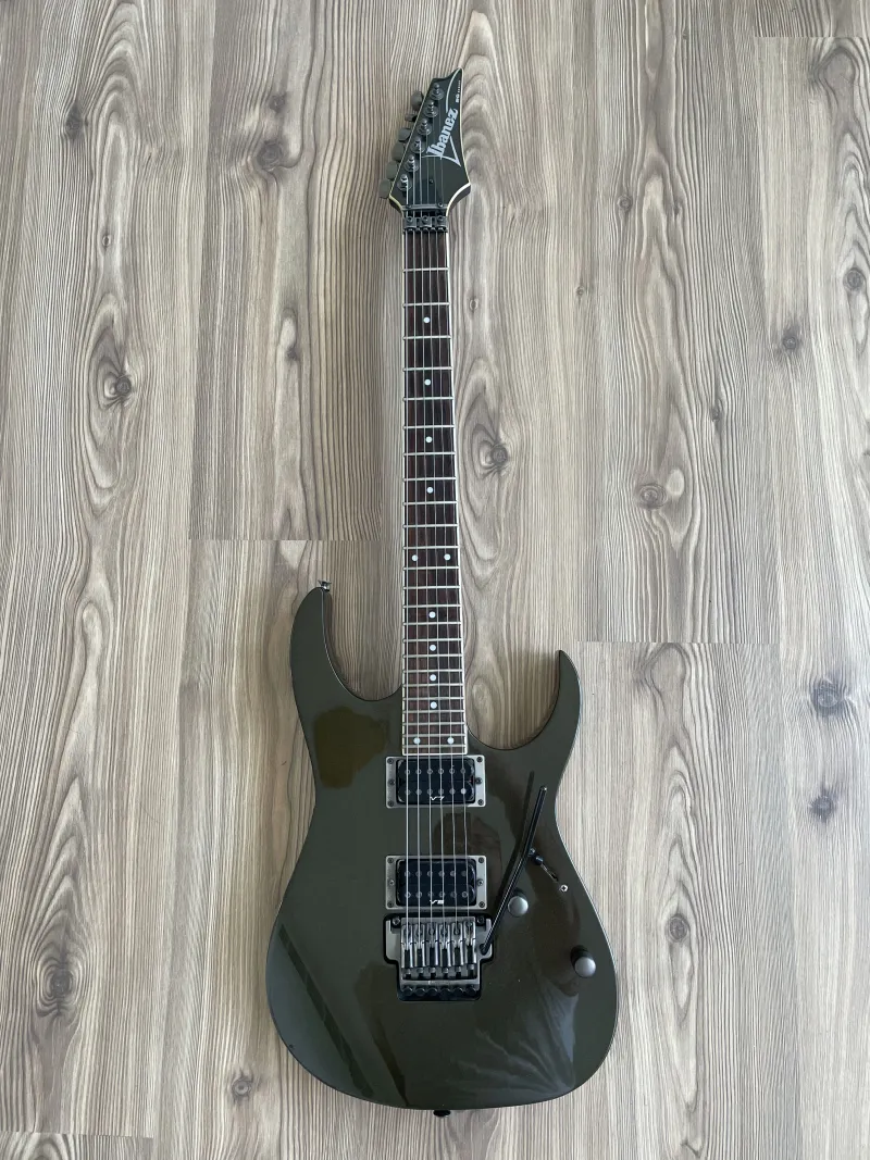 Eladó ritka, átmenőnyakas 2003as Ibanez RGT42 koreai gitárom. A gyári pickupok cserélve japán Ibanez V7 V8 szettre, komoly hang, a gyárinál sokkal jobb. A test anyaga hársfa, az átmenőnyak 5 részes jávor-dió. Rózsafa fogólap, Edge Pro II tremoló, a kar is megvan hozzá. A nyak nagyon kényelmes, a szokásos Ibanez “papír˝ nyaknál kicsit vaskosabb D nyak, különösen kényelmes a felsőbb fekvésekben az átmenőnyak miatt. Két megjegyzés a gitárral kapcsolatban:A D húrnál a baba egy nagyon picit más méret, szerintem nem pontosan a típushoz való, egyébként filléres alkatrész, a játékban nem zavar. A másik, hogy amikor a gitár hozzám került volt egy apró repedés hátul a testen az egyik tremolo tőcsavarnál. Ez szakszerűen javítva lett fa pótlással még az Oroszlánbarlang által, kizárólag hátul a takaró lemez alatt látható a beavatkozás nagyon kis helyen, de ott is nagyon korrekten megcsinálva, az utolsó képen látható. Ez nem változtat a gitár minőségén, hangján, megjelenésén csak korrektnek tartottam leírni.