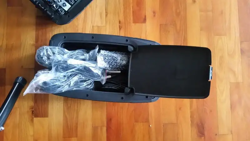 Az egyik hangfal hátuljára az erősítő, míg a másik hátuljára a vezetékek és a mikrofon tárolója csatlakoztatható.