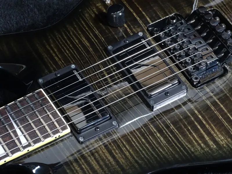 2010-2011-es, Made in Japan Jackson Soloist Archtop transparent black színben. Testen átmenő nyak, FloydRose. Az eredeti EMG helyett Fishman Fluence Toshin Abasi szettel modernizálva, 3 hangzás, 5 állású kapcsoló, push/pull pot (fishman.com A tremoló tőke nagyobb réz tőkére lett cserélve (az eredeti is megvan). A hangszer állapota kiváló, fényezésen normál használat nyomai láthatók, de semmi komoly sérülés. Szépen beállítva, bundok rendben, szuper alacsony húrnyomás (~1.2-1.1 mm). Saját kemény tokjával, kulcsokkal együtt.Posta OK.