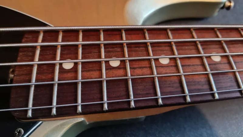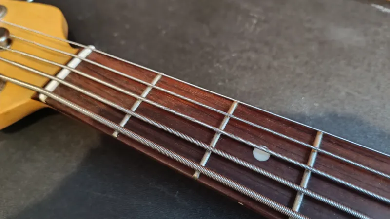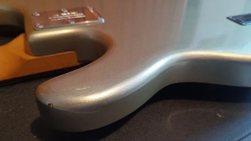 A gitár harcra kész állapotban beállítva, új húrokkal várja új gazdáját.