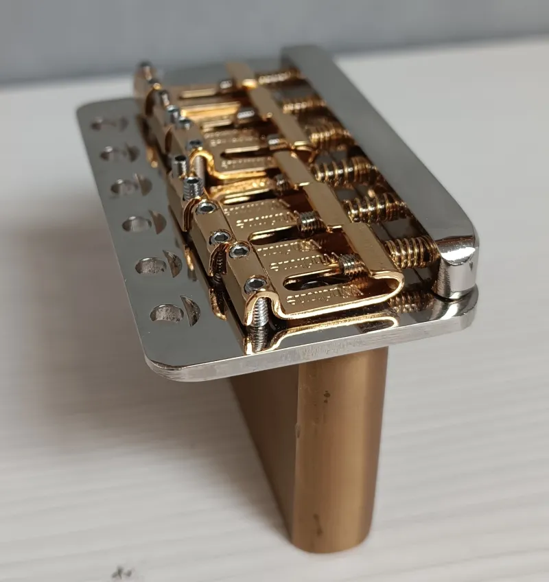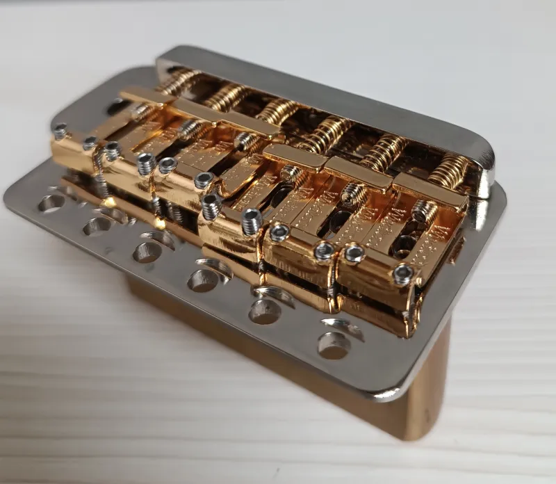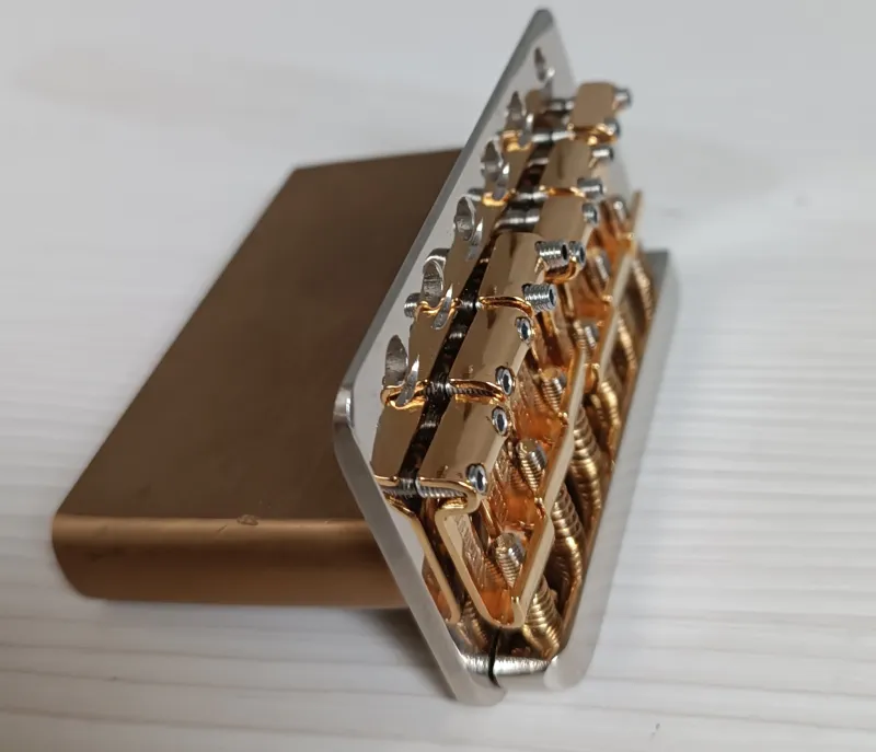 A Wudtone Guitar Innovation által fejleszetett, bicolour PRS tremoló upgrade-et kínálom megvételre. Az eredeti , gyári PRS tremoló 6 nútolt csavaron billen el. Egyrészt a hat csavar eleve tompítja a húrok és a test közötti rezonancia átvitelt. Másrészt a hat csavart úgy beállítani, hogy a nútok teljesen egy vonalba legyenek kész művészet. Ha ez nem sikerül, akkor a rezonancia átvitel tovább tompítódik. Aki már szedett szét PRS tremolót tudja, hogy pontatlan beállítás miatt a csavarokon a nút gyakran bemaródik, a tremoló alaplapon az élek deformálódnak. Ezt a problémát kezeli a Wudtone tremolója. A készlethez kapott hat csavaron nincsenek nútok, csak az alaplap testhez viszonyított helyzetét határolják be. A hat csavar alá egy acél lemez kerül. A tremoló alaplap ezen nyugszik és fordul el, állandó kontaktust fenntartva a test és a tremoló között. A rezonancia átvitel drámaian megváltozik. Erről itt láthatsz egy videót: . Ha fényesebb, egyedi hangt akarsz a gitárodnak, vagy a tremolód már megkopott akkor ez egy neked való eszköz. Amúgy is érdemes ellátogatni a gyártó honlapjára. www.wudtone.com Nagyon sok hasznos gitáros dolgot árulnak. Nekem a legjobban a káprázatos színeket adó finishing kit-ek tetszenek.Envío