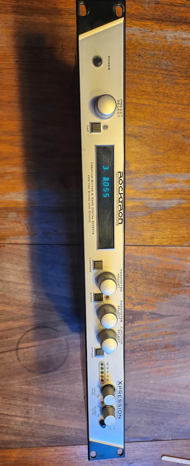 1U méretű rack-egység. Az erősítő effekt loopjába kell kapcsolni. Analóg párhuzamos effektút! Kiválóan látható kijelző, bár egy karakter halott, de ettől még simán használható. Effektek: minden, ami az effektútba kellhet: kompresszor, zajzár, EQ, kórus/flanger, phaser, tremolo, visszhang (delay), zengetés (reverb). MIDI-vel vezérelhető. A ki- és bemeneti jel külön analog potikkal szabályozható. Kiválóan szóló darab.Az alábbi videót evvel az effekttel készítettem (a kijelző csak a videón villog):