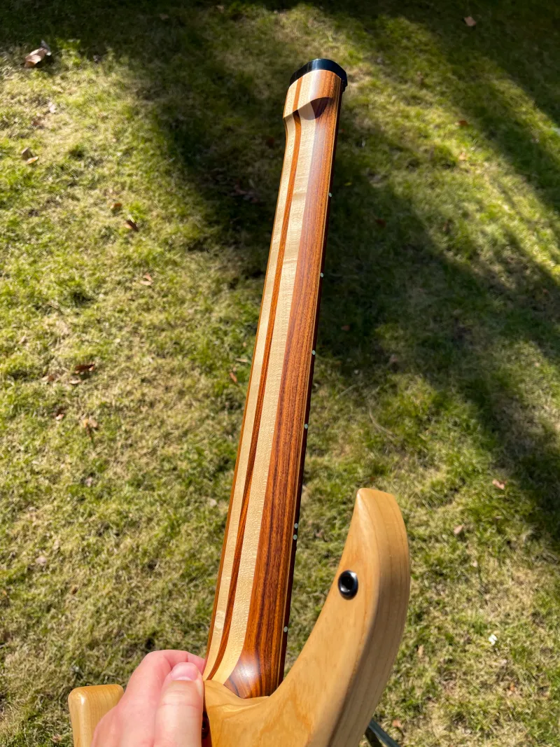 I`m selling one of the first custom piece of the Shoggie model, made in 2015, with a satin deep blue burst finish. Body is figured swamp ash, top flamed/poplar burl, 5-piece neck: indian rosewood/ flame maple, indian rosewood bounded birdseye maple fingerboard, scale is 25,4-27``, pickups are Bare Knuckle Juggernaut set, WDM mod switch (normal/split-coil/acoustic), luminlays side dots, stainless steel frets, weight only 2,3kg. The guitar has giant resonance, it`s loud, and the sound is very balanced across the scale. The guitar is set up and ready to rock! It has a few minor dings in the top layer, but nothing significant. Hardcase and straplocks included. Shipping from the Czech Republic, insured & tracked via courier.Envío