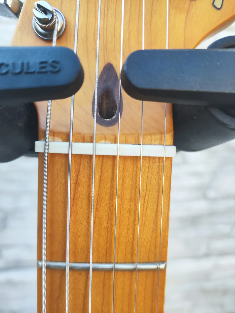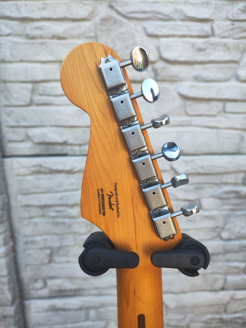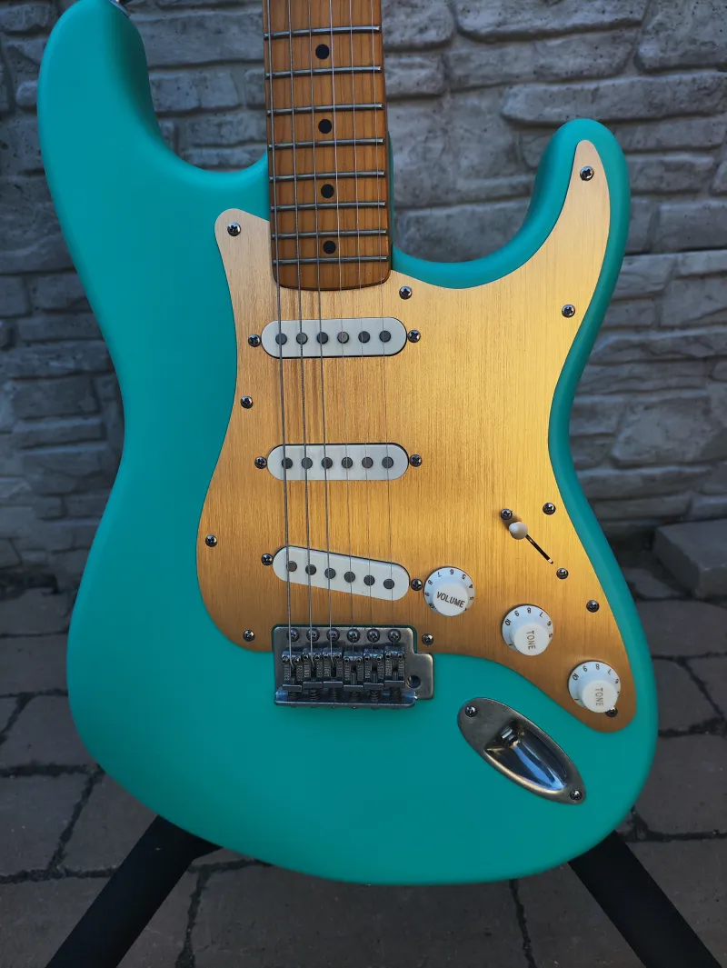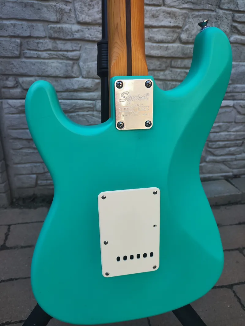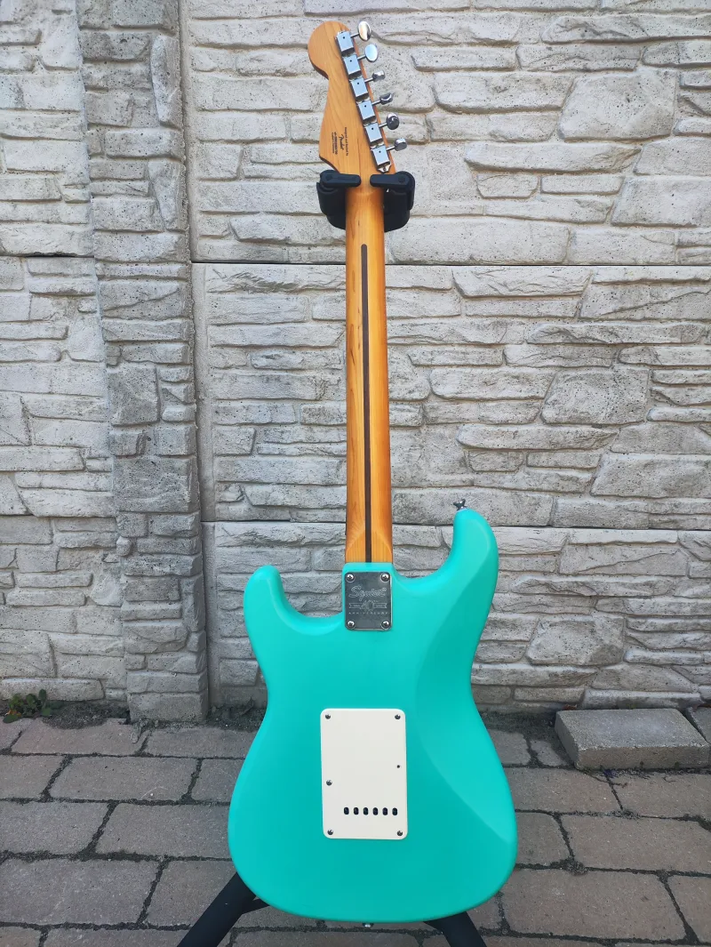 Eladó 40. évfordulós, limitált kiadású - 2022-ben 1 évig gyártott - matt Seafoam Green színű Squier Stratocaster. Második tulaja vagyok. A hangszer kapott egy GraphTech nyerget, minden más eredeti. Két apró lakk lepattanáson kívül sérülésmentes. Ezeket az utolsó képen láthatod.3,2 kilós súlyával a könnyebb gitárok közé tartozik. A Classic Vibe szériához hasonló minőség, pár apró különbséggel. Gyárilag öregített szerelékek, selyemfényű lakkozás a nyakon. A nyak kinézete megtévesztő, nem égetett juhar, csak színezett lakkozású.