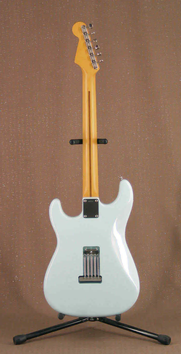 huendeskes Origen: EE. UU. Warmoth Stratocaster ensamblado según las más altas exigencias. Todos sus componentes son de fabricación estadounidense. mástil de arce con diapasón de palisandro, trastes 6115, radio moderno de 11-16˝ cuerpo de aliso, acabado nitro vintage azul, pastillas Klein Jazzy Cat (pickguard totalmente cargado), hardware Callaham Vintage S model Strat. Calidad impecable y sonido increíble.