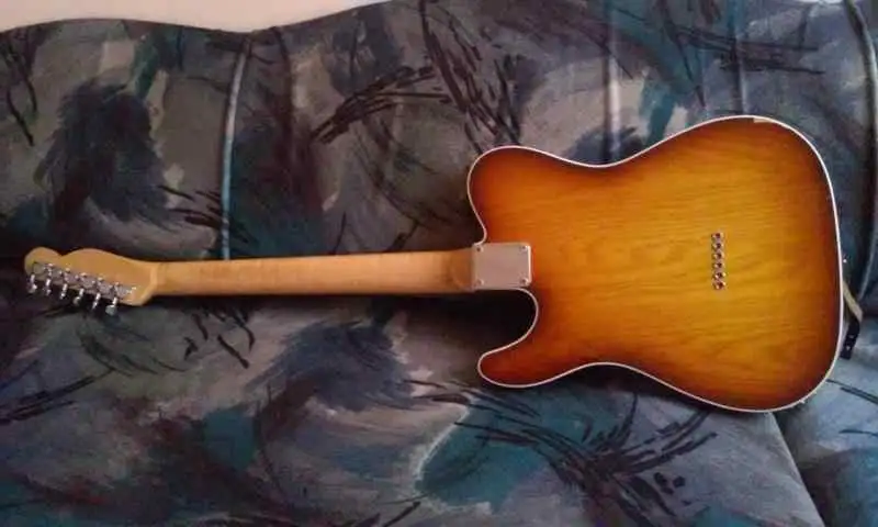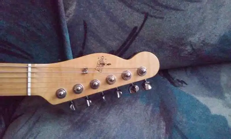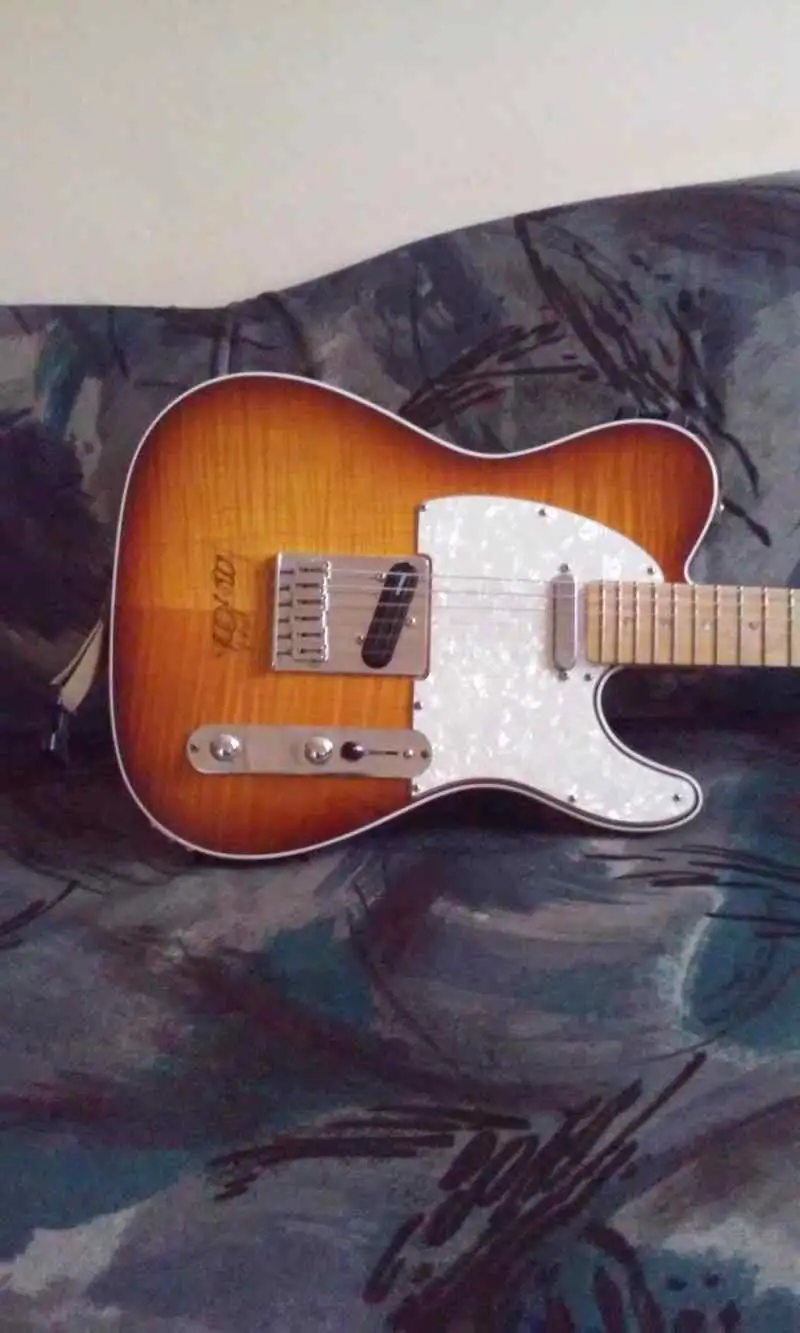 huendeskesCompré la guitarra a Ádám Nagy (Roy&Ádám Trio) en 2012, él se la hizo hacer en EE. UU. Desde entonces, no ha sufrido ningún cambio excepto el cambio de cuerdas, la cuidé mucho. Sobre la guitarra en general: cuerpo de fresno con tapa de arce flameado, ribetes blancos en ambos lados del cuerpo. Mástil Warmoth Modern Pro de arce flameado, diapasón de arce, 22 trastes, incrustaciones de puntos de nácar, clavijero tele invertido. Clavijeros y puente Gotoh, pastilla Dimarzio Fast Track en el puente, Seymour Duncan (no sé el modelo) singlebucker en el mástil. Viene con una correa Dimarzio con hebilla y un estuche rígido SKB. Hay un pequeño daño en la parte posterior del cuerpo, que causó Ádám, y él también me dedicó la guitarra.