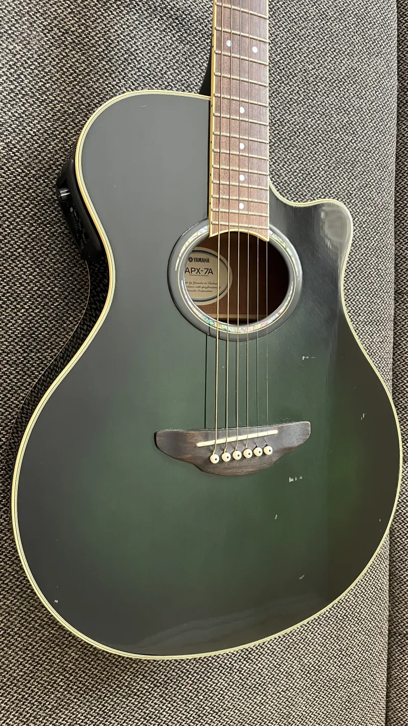 Használt, de jó állapotú ˝transz-green˝ sötétzöld átmenetes színű Yamaha APX-7A elektroakusztikus gitár eladó.