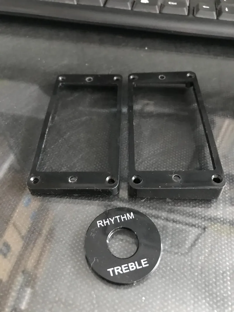 Eladó egy fekete humbucker keret pár a pickup váltó gyűrűvel együtt. Alja enyhén ívelt, a les-paulom ívét nem teljesen követi, tehát annál kevésbé ívelt testhez passzol.