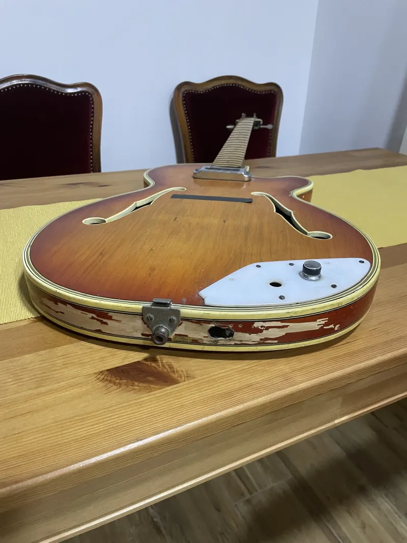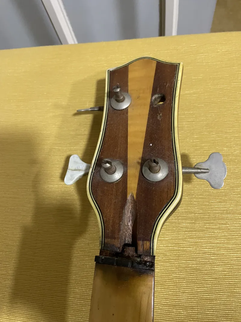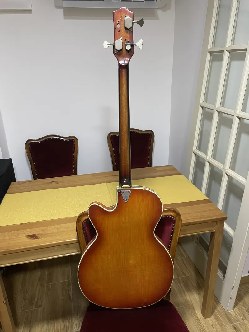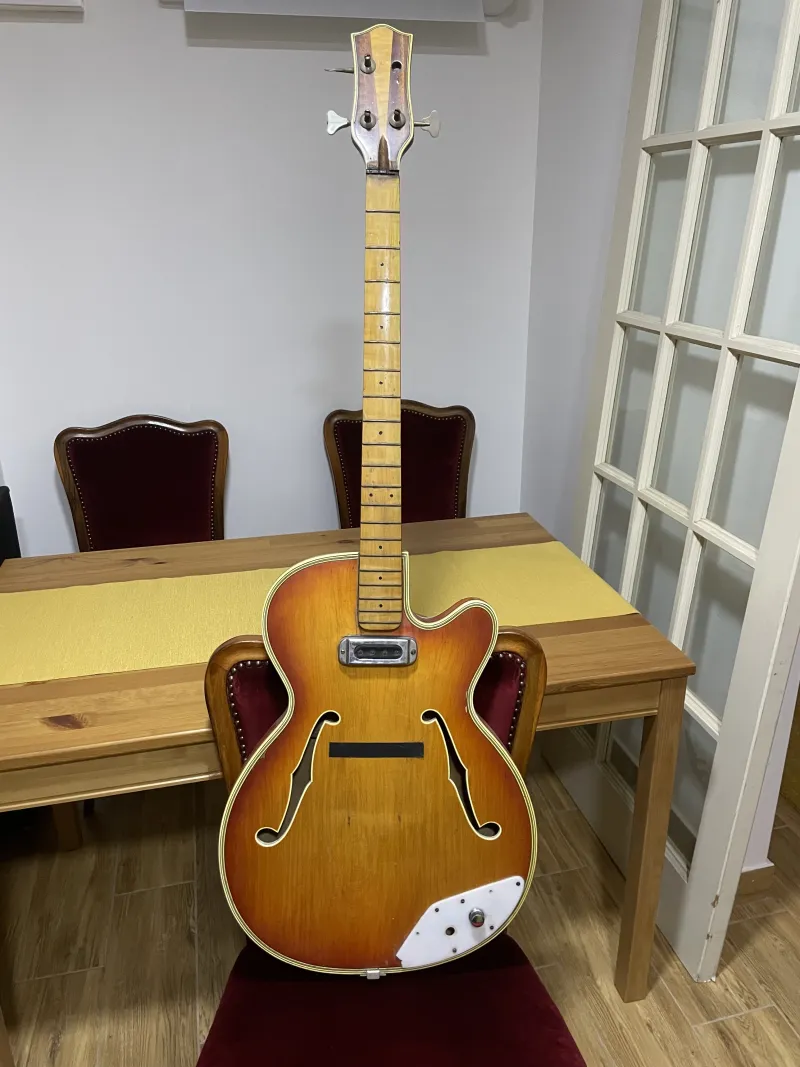 Felújítás elött álló , vélhetően kelet európai hangszer a 60-70’ s évekből .F lyukas 4 húros basstusgitár a képeken látható állapotban .